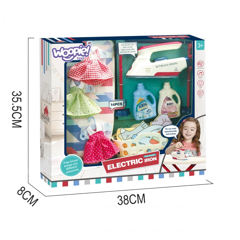 Prekės ženklo WOOPIE lyginimo rinkinys suteiks jūsų vaikui daug džiaugsmo. Lygintuvas yra vaikams saugus žaislas, nes jis neįkaista. Jame įdiegta daug funkcijų, kad žaisti būtų įdomiau: tikro vandens purškimo funkcija, šviečianti LED lemputė ir garso efektai. Žaislas taip pat veikia neužpildytas vandeniu. Tai puikus rinkinys vaikams, mėgstantiems mėgdžioti tėvus kasdienėje veikloje.