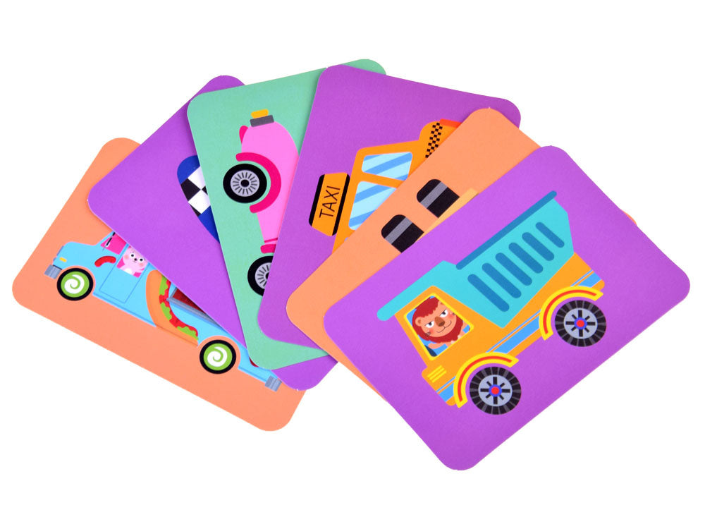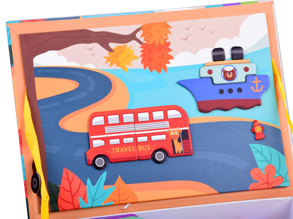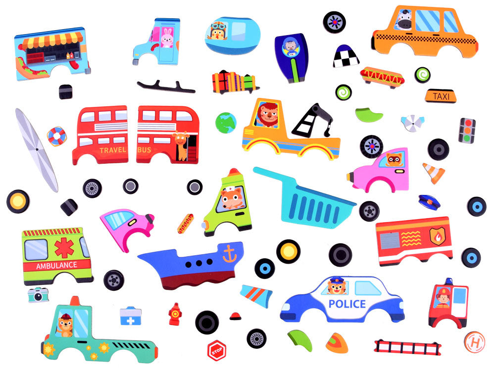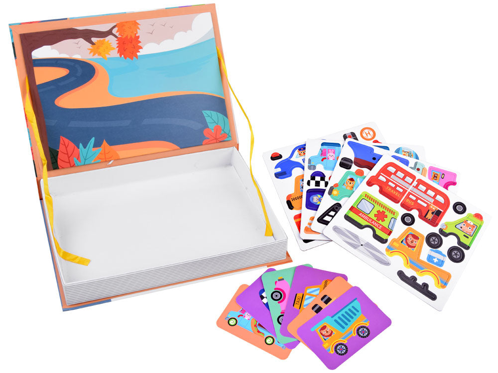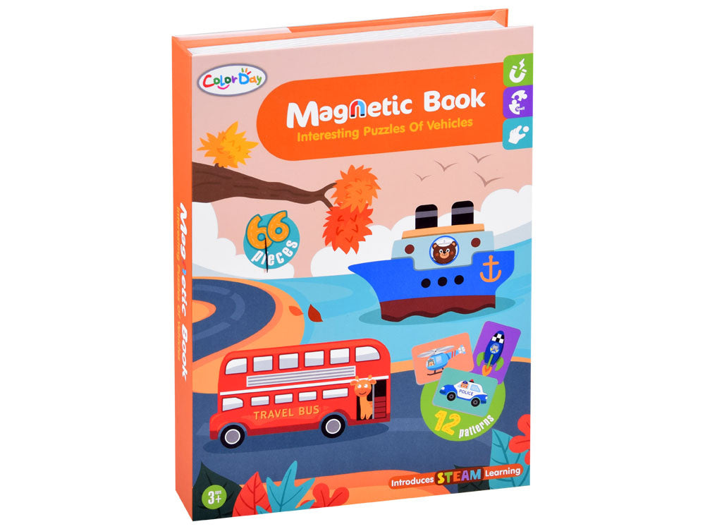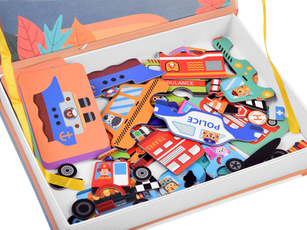 Magnetinės transporto priemonės – tai dėlionė, susidedanti iš 66 elementų, kuri leis vaikui iš kortelių savarankiškai susikurti parinktas transporto priemones, taip pat susikurti savo unikalią transporto priemonę. Viduje knygos yra danga su keliu, ant kurio turėtų būti pastatytos transporto priemonės.