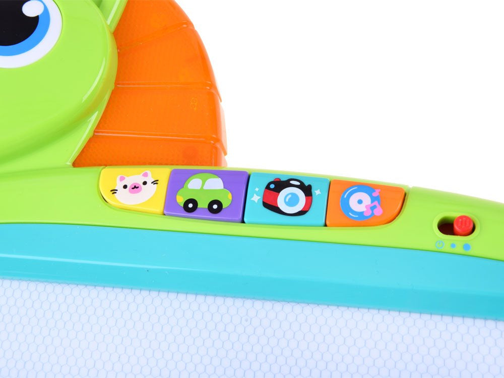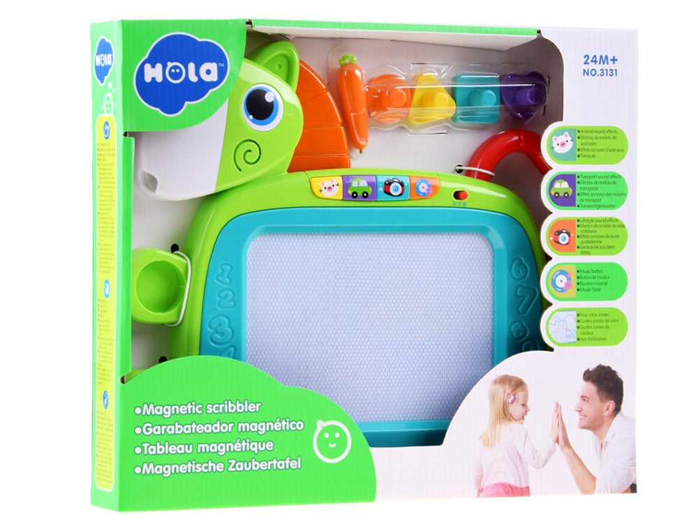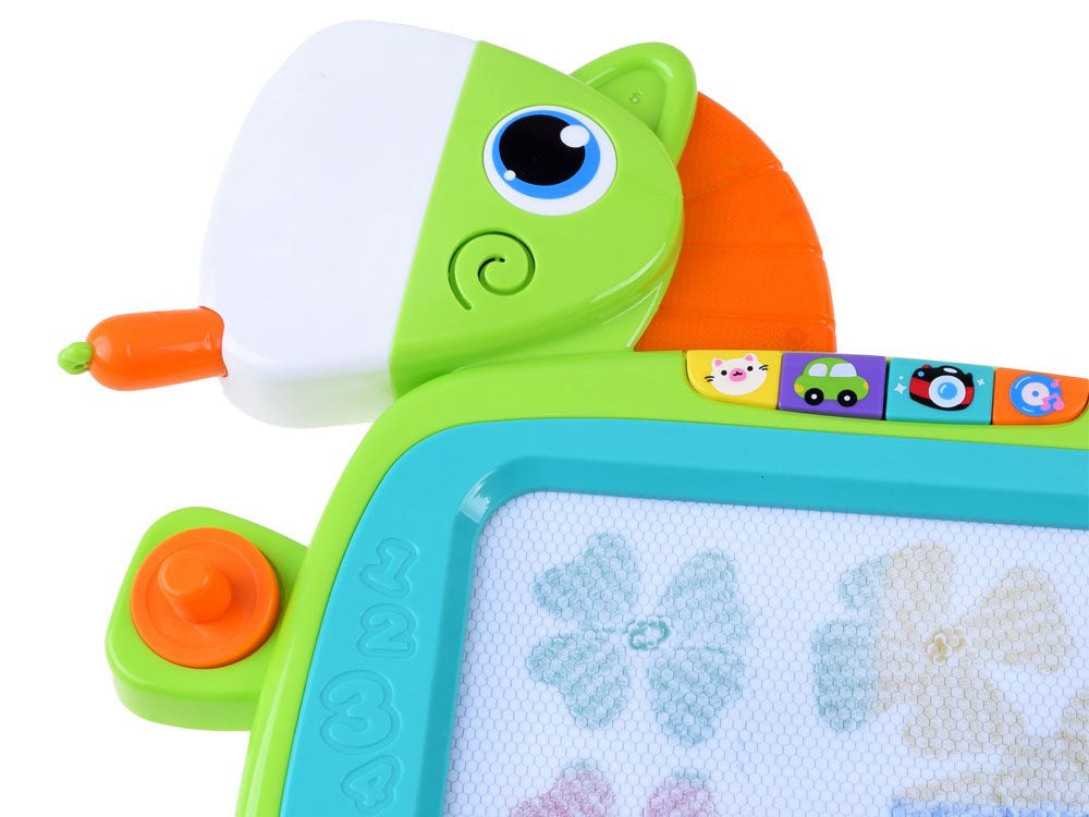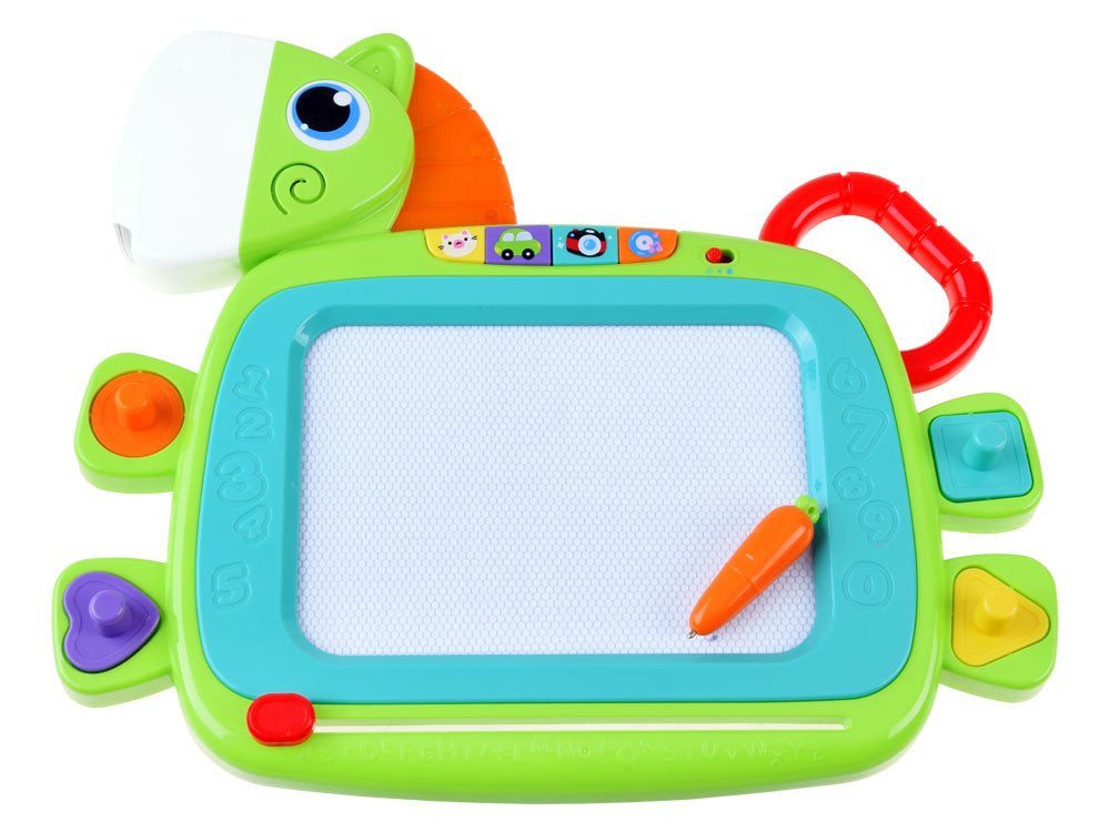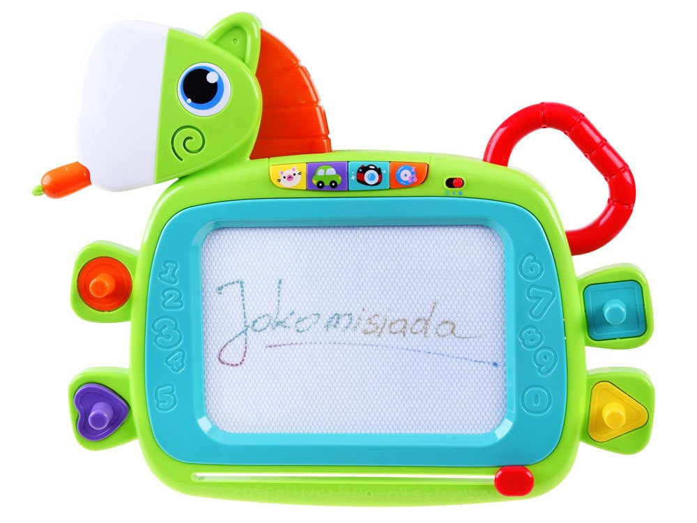 Magnetinė lenta labai lengva ir dėl arklio uodegą imituojančios rankenos ją galima pasiimti beveik bet kur. Magnetinė lenta turi daug privalumų, pavyzdžiui, garsą ir šviesą. Gale yra įjungimo ir išjungimo jungiklis ir spalvoti mygtukai garsams skleisti. Lentelės fonas yra įvairiaspalvis, o piešimas keičiasi priklausomai nuo to, kur rašote ar piešiate. Galite piešti ant lentos, rašyti rašikliu arba naudoti antspaudus raštams kurti.