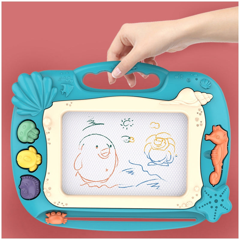 Magnetinė lenta suteikia galimybę kūrybiškai linksmintis! Komplekte yra patogus rašiklis ir 2 antspaudai, kurie paįvairins piešimą. Piešimo lenta turi patogią rankeną, todėl vaikas ją gali pasiimti visur.