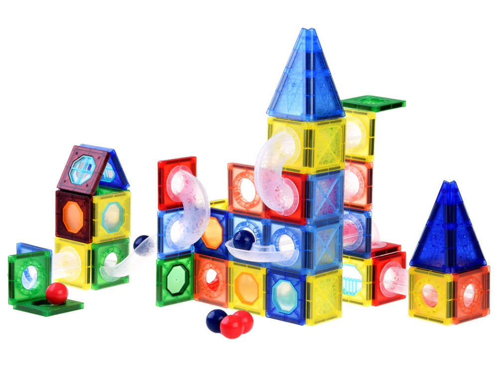 Spalvingos kaladėlės pagamintos iš skaidraus plastiko, fantastiškų spalvų. Blokeliai labai lengvai jungiasi vienas su kitu, iš jų galima statyti įvairių tipų labirintus - kalnelius ir jais šaudyti į rinkinyje esančius kamuoliukus. Žaisdamas vaikas mokosi formų ir spalvų bei lavina smulkiąją motoriką.