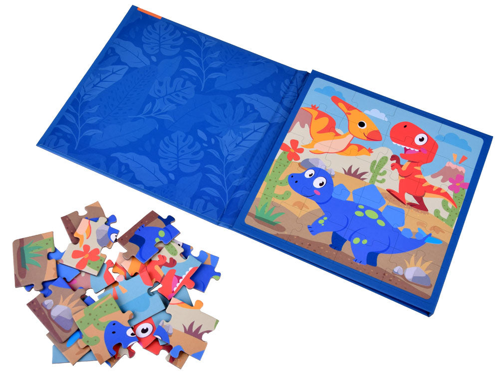 Spalvingos magnetinės dėlionės, įdėtos į kietą knygą, suteiks kiekvienam vaikui daug kūrybinio džiaugsmo. Vaiko užduotis - priderinti elementus vieną prie kito, kad sudėliotų dėliones su linksmais dinozaurais.