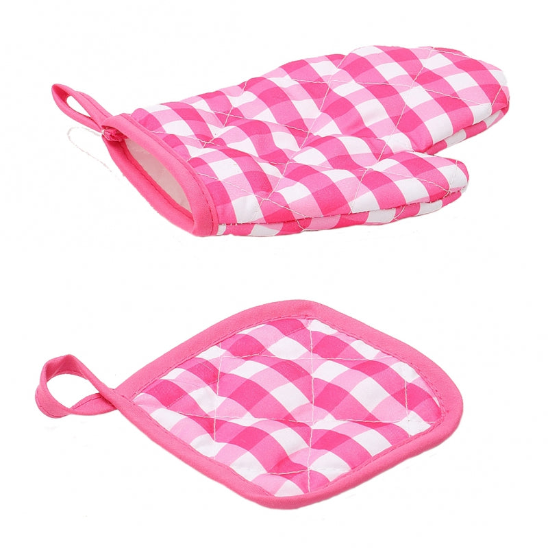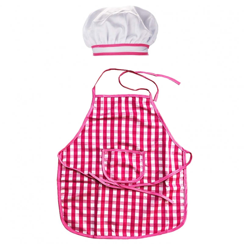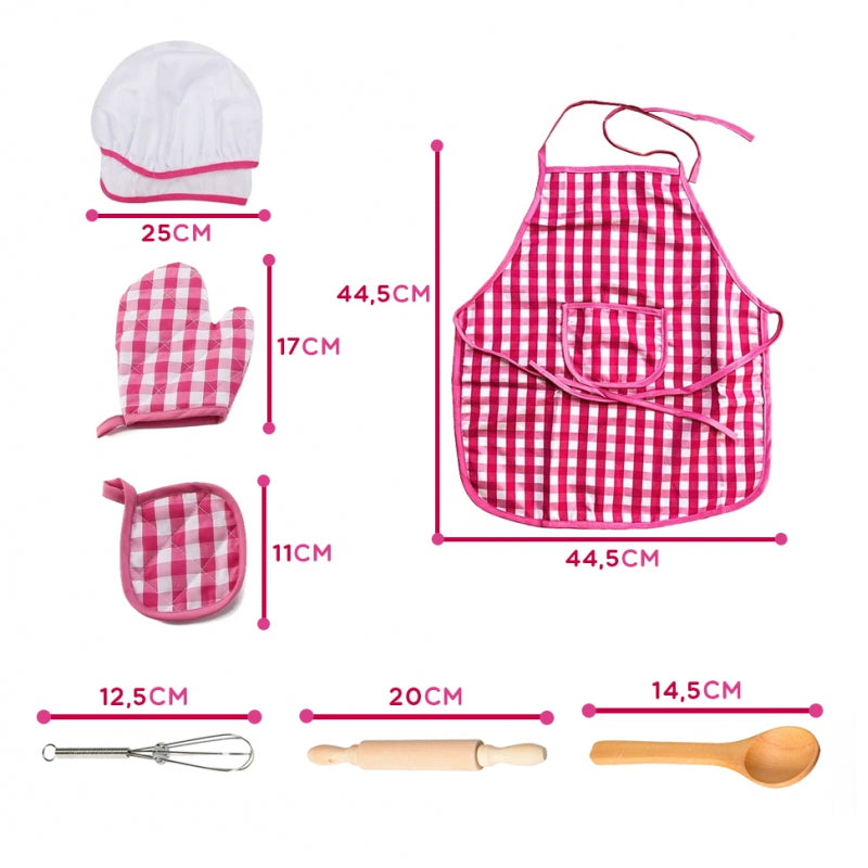Į komplektą įeina: prijuostė, skrybėlė, orkaitės kumštinė pirštinė, audinio pagalvėlė, maždaug 20 cm ilgio kočėlas, medinis šaukštas ir metalinis šluotelė.