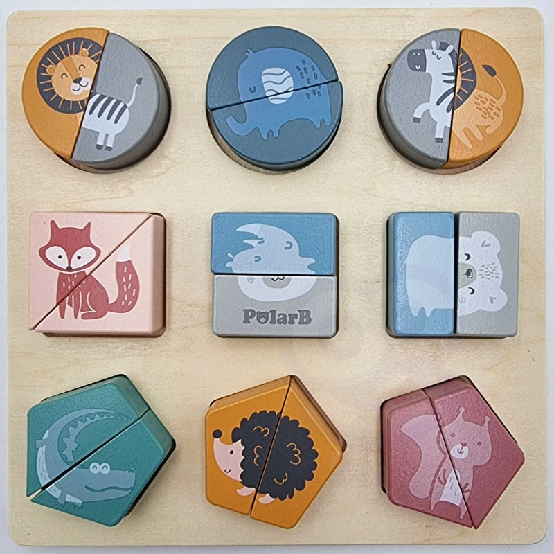 - Dėlionės rinkinį sudaro 9 rinkiniai, iš kurių kiekvienas gali būti sukurtas kitam gyvūnui (įskaitant zebrą, lapę, lokį, raganosį, ežį, voverę, liūtą, krokodilą ir dramblį).