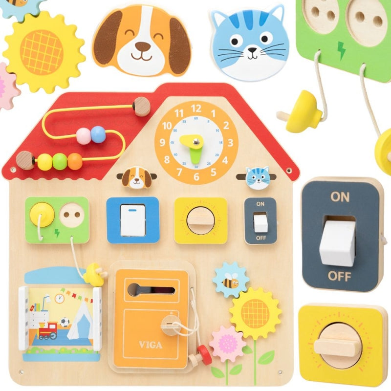 Ši žavinga, spalvinga „Namelis“ veiklos lenta iš Viga yra fantastiškas žaislas, kuris akimirksniu pažadins jūsų vaiko smalsumą ir paskatins jį aktyviai įsitraukti į žaidimą! Apgalvotas, namelio formos, dizainas slepia 8 interaktyvius elementus, kurie suteiks valandų valandas kūrybinio malonumo. Atidaromos durys, slankūs slankikliai, judamieji krumpliai ir karoliukų labirintas – tai tik keletas atrakcijų, kurios skatina motorinių įgūdžių vystymąsi ir koordinaciją. Lenta gali būti lengvai pritvirtinta prie sienos arba pastatyta ant stalo, todėl ji yra labai praktiška ir universali.