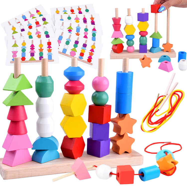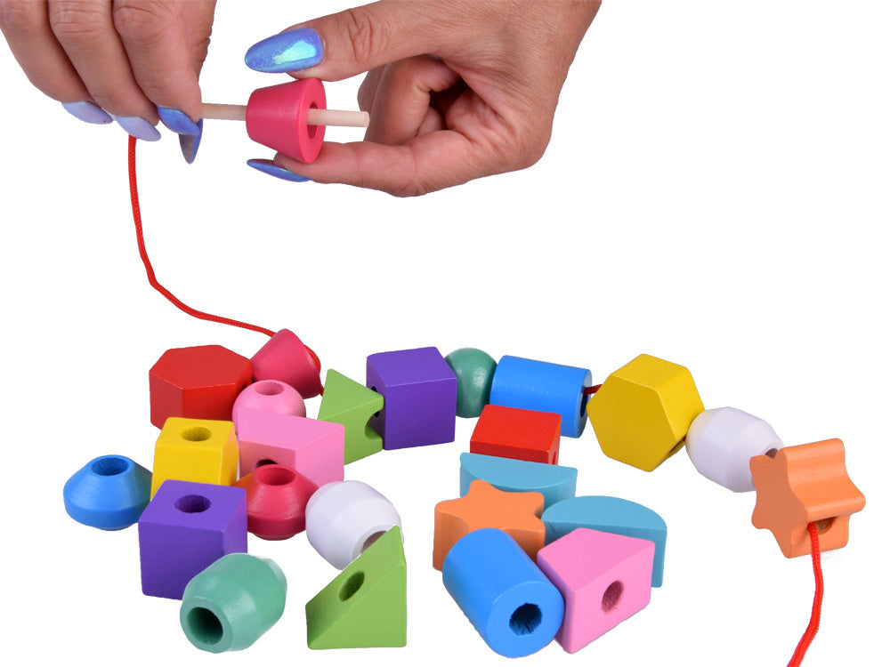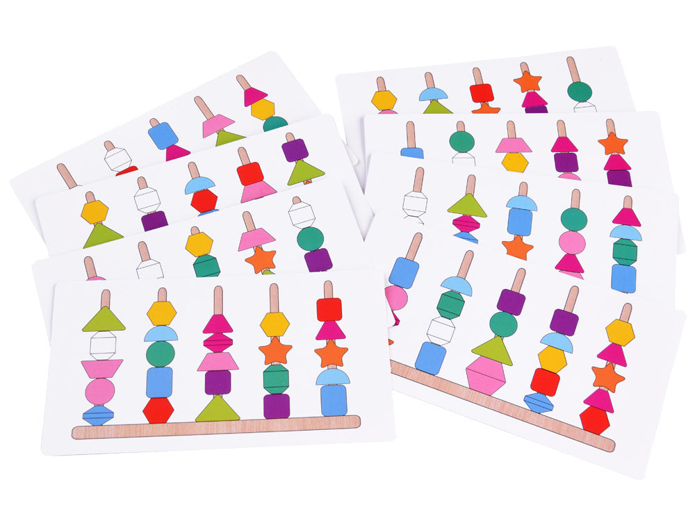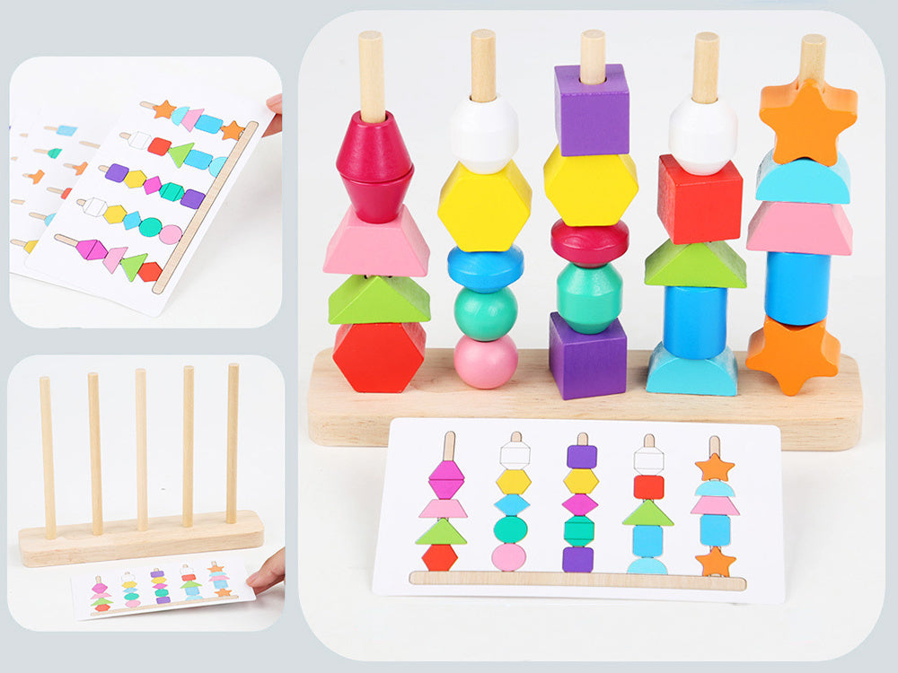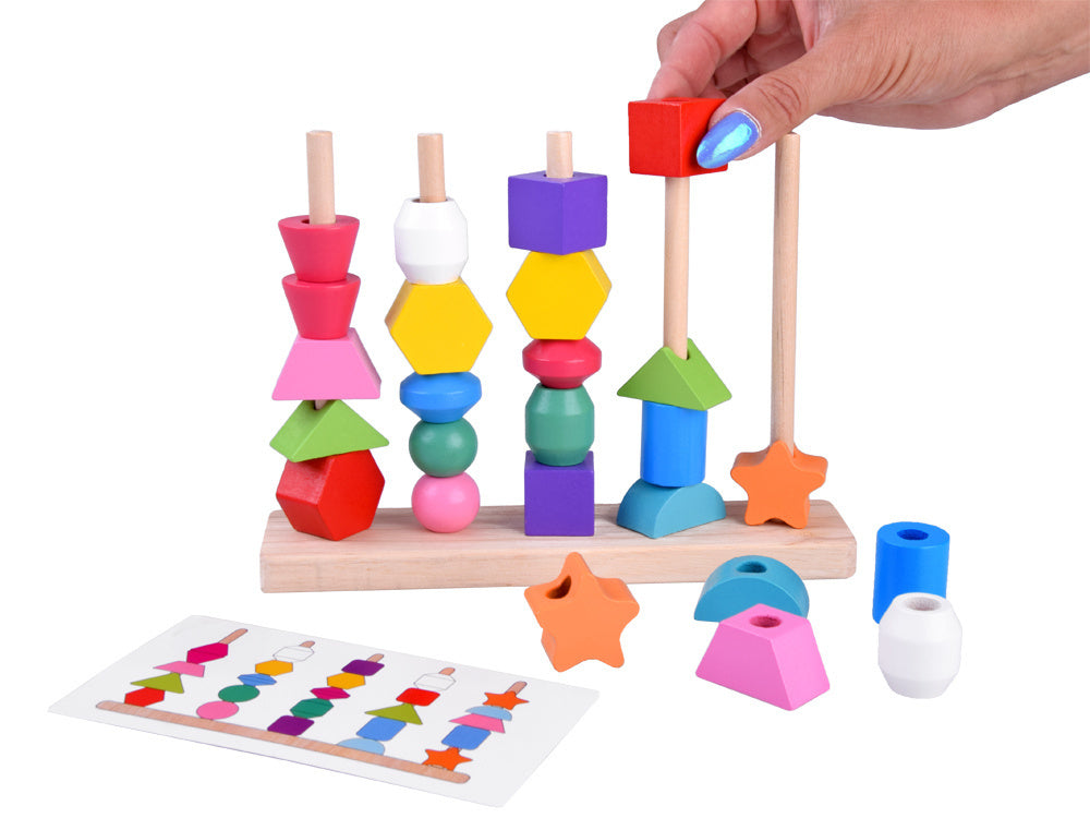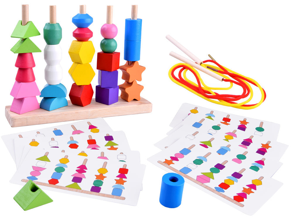 Medinė mokomoji dėlionė leis lavinti daugybę įgūdžių vienu metu. Ji teigiamai veikia regos, lytėjimo pojūčius ir gebėjimą atskirti formas, spalvas ir akies-rankos koordinaciją bei rankų darbo įgūdžius. Vaikas su medine dėlione gali žaisti dviem būdais - dėliodamas kaladėles ant pagaliukų pagal pridėtas korteles arba juos vyniodamas ant virvutės. Rinkinys supakuotas į spalvingą dėžutę, kuri puikiai tiks kaip dovana.