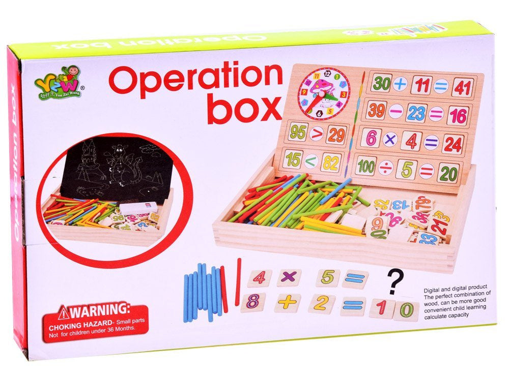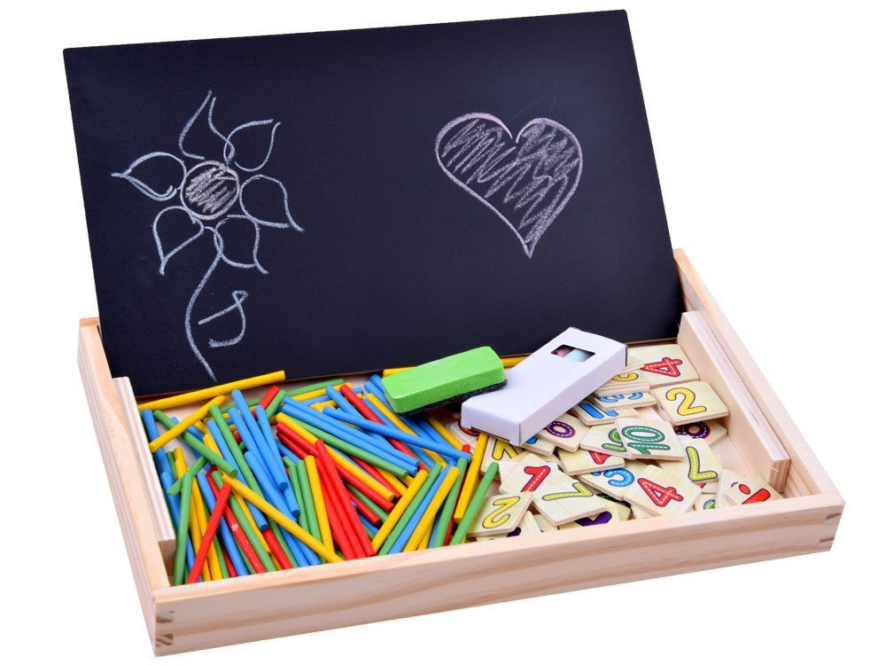 Mokomasis matematikos rinkinys padės žengti pirmuosius matematikos žingsnius. Rinkinys pagamintas tik iš medžio, uždaros dėžutės formos. Viena lentynos pusė skirta rašyti kreida, kitoje pusėje yra paveikslėlių su gyvūnais ir skaičiais.