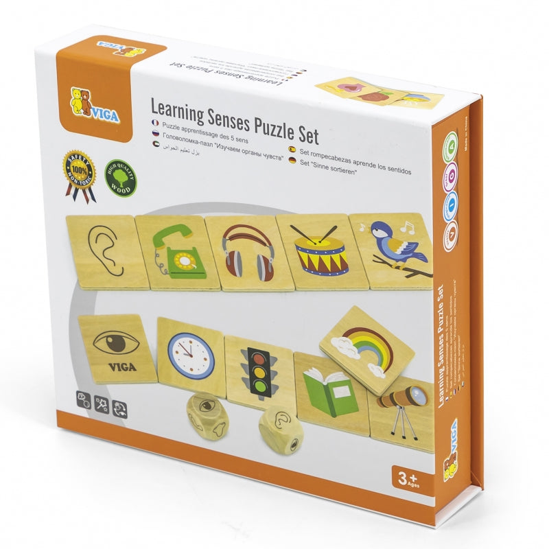 Medinė dėlionė, skirta mokytis pojūčių ir rūšiuoti. Vaiko užduotis - priskirti objektus pasirinktiems pojūčiams. Paveikslėliuose pavaizduota daug kasdienių daiktų, pvz., meškiukas, automobilis. Visas rinkinys pagamintas iš medžio ir nudažytas netoksiškais dažais.