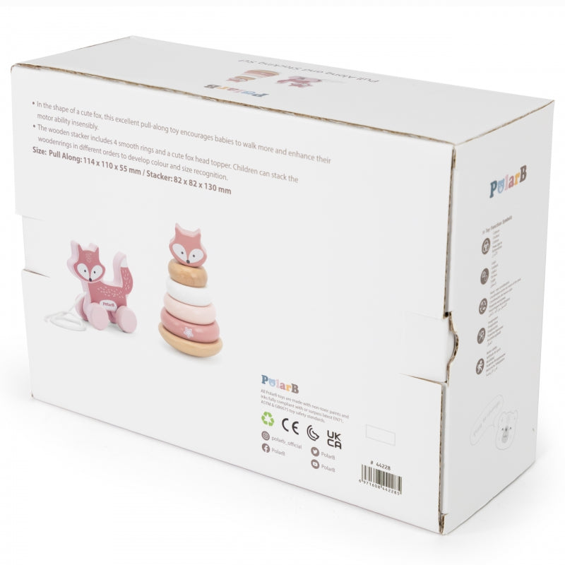 Šį "Viga" prekės ženklo rinkinį iš "PolarB" kolekcijos sudaro du pasteliniai mediniai žaislai: tai lavinamoji piramidinė ir traukiama lapė. Abu žaislai ne tik smagiai užpildys jūsų vaiko laiką, bet ir padės lavinti motorinius įgūdžius, loginį mąstymą ir spalvų mokymąsi.