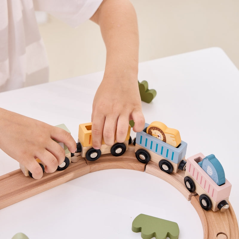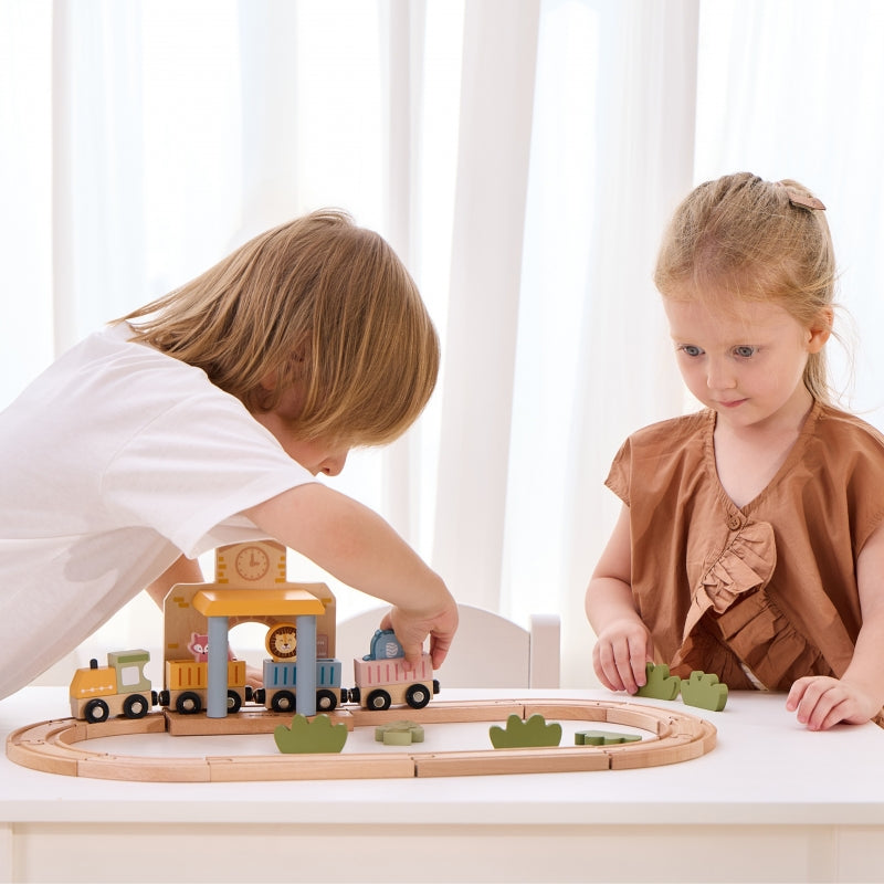 PolarB medinio traukinio rinkinys 30 el. yra puikus pasirinkimas mažiesiems traukinių mylėtojams! Jį sudaro 30 dalių, įskaitant įvairius bėgius, interaktyvią stotį ir priedus, kurie leidžia kurti savo žaidimų scenarijus. Be to, pridėtoje instrukcijų knygelėje lengva sukurti tikrovišką traukinių stoties sceną. Traukiniui važiuojant per stotį magnetu aktyvuojama garso funkcija dar labiau įtraukia į žaidimą. Medinės detalės yra tvirtos ir ilgaamžės, o jų universalumas skatina vaikus žaisti laisvai ir kūrybiškai.