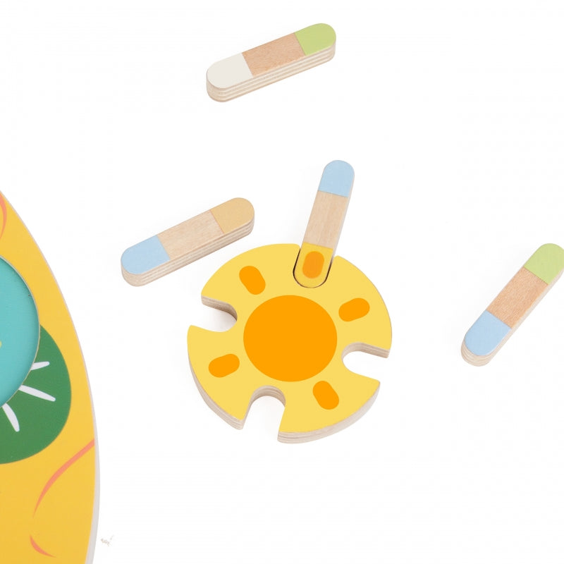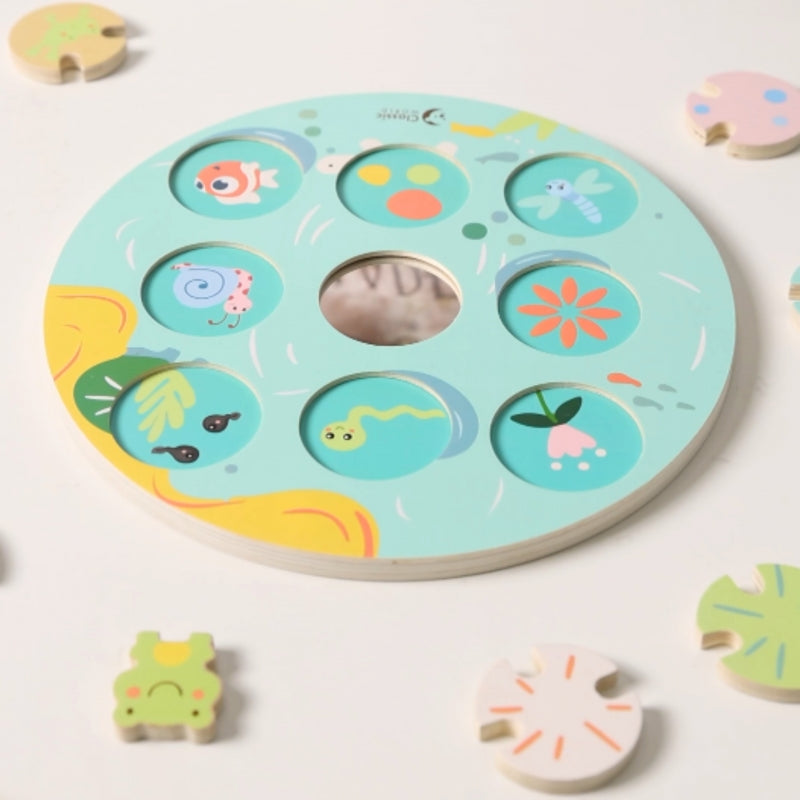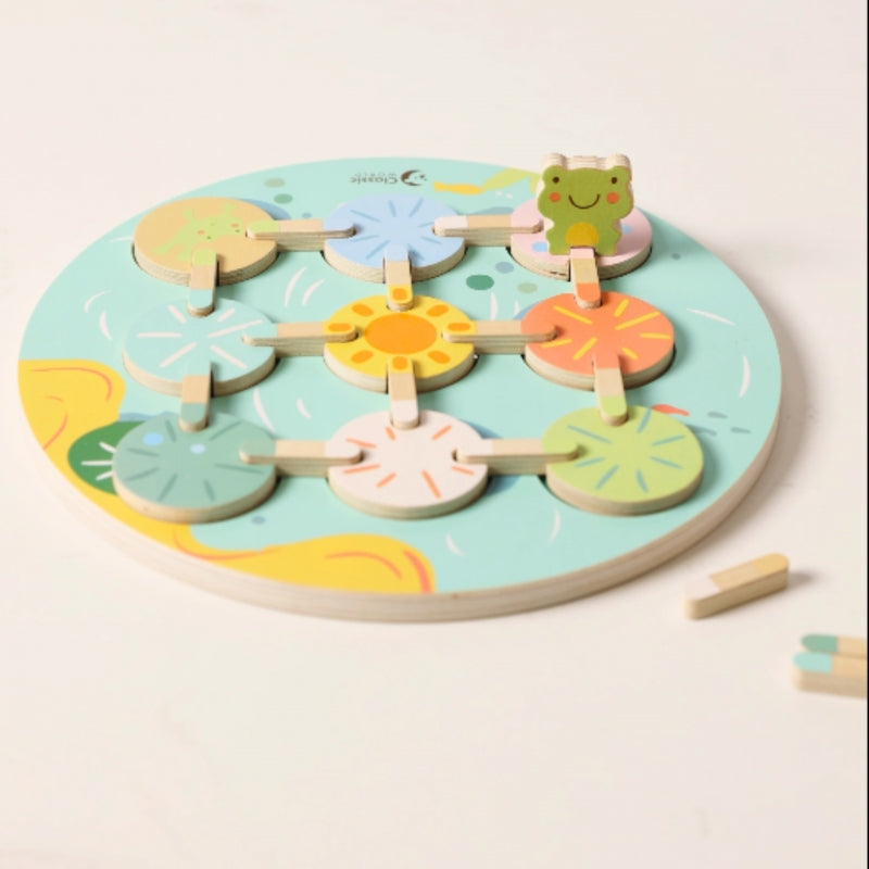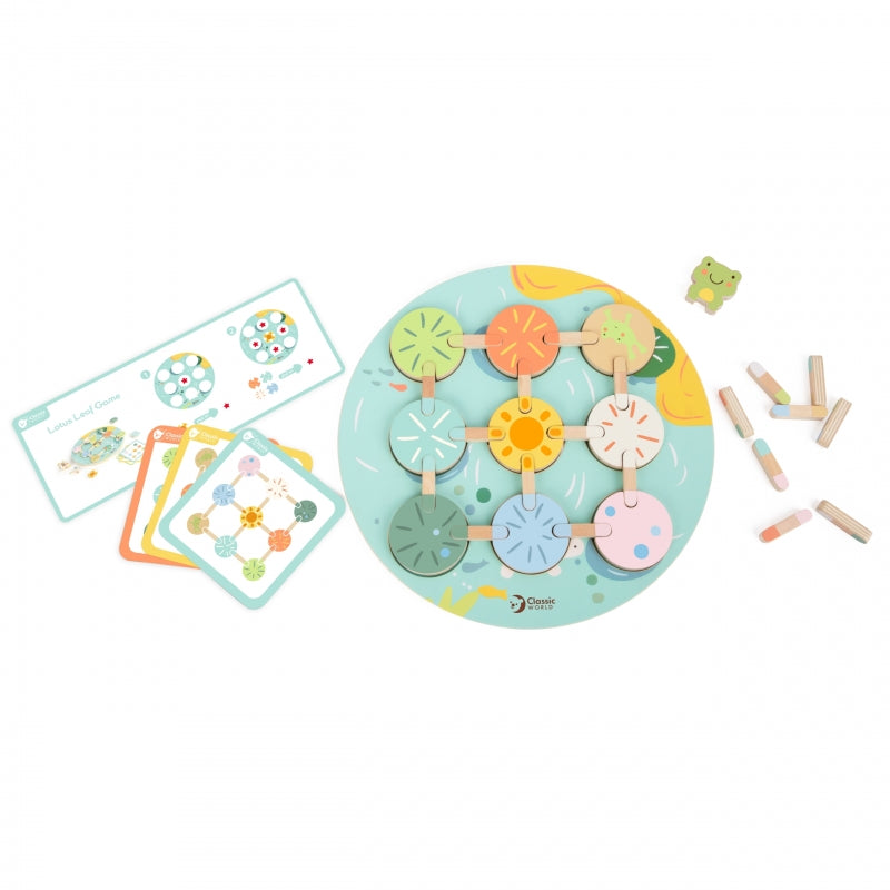 Pasinerkite į tvenkinių ir gamtos pasaulį su žaviu edukaciniu žaidimu „Lotus Leaves“! Šis unikalus žaislas, skirtas spalvų ir formų suderinimui, stimuliuoja vaizduotę ir moko loginio mąstymo per žaidimą. Mediniai elementai, malonios spalvos ir mielas varliukas suteiks vaikams valandų valandas džiaugsmingo ir kūrybiško žaidimo. Žaidimo tikslas – sujungti lapus su spalvotomis lazdelėmis, kad būtų sukurtas ištisinis takas varlei, laikantis užduočių kortelių nurodymų.