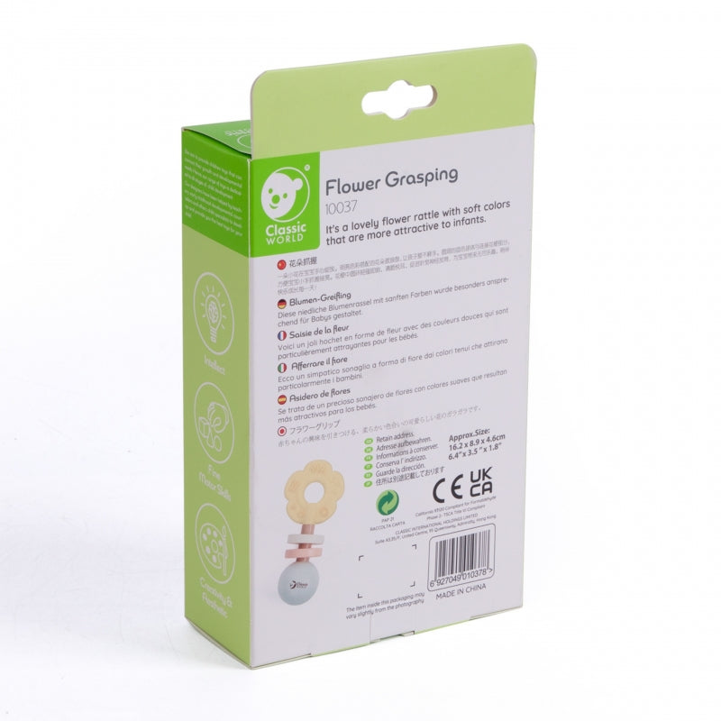 Šis žavus gėlės formos barškutis buvo sukurtas specialiai mažiausiems vaikams. Švelnios pastelės spalvos pritraukia vaiko dėmesį, o malonus liesti paviršius ir tinkamas dydis leidžia lengvai jį paimti ir purtyti. Žaislas pagamintas iš saugių medžiagų – medžio ir silikono – todėl tinka vaikams nuo pirmųjų gyvenimo dienų.