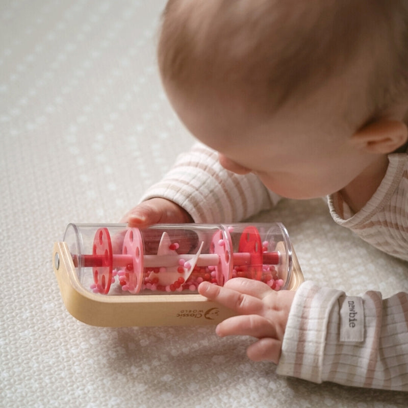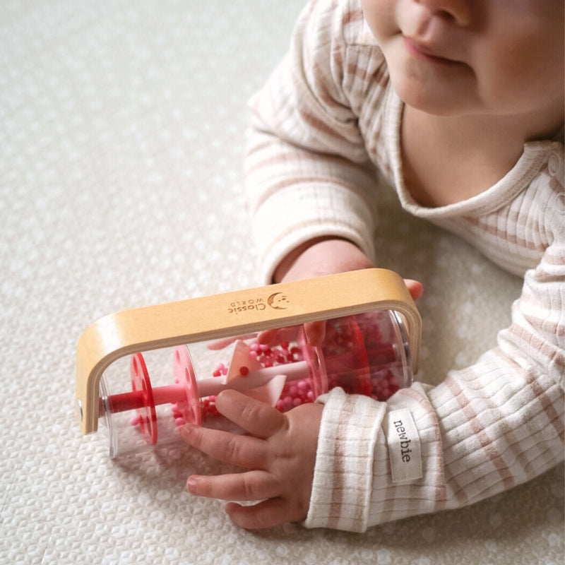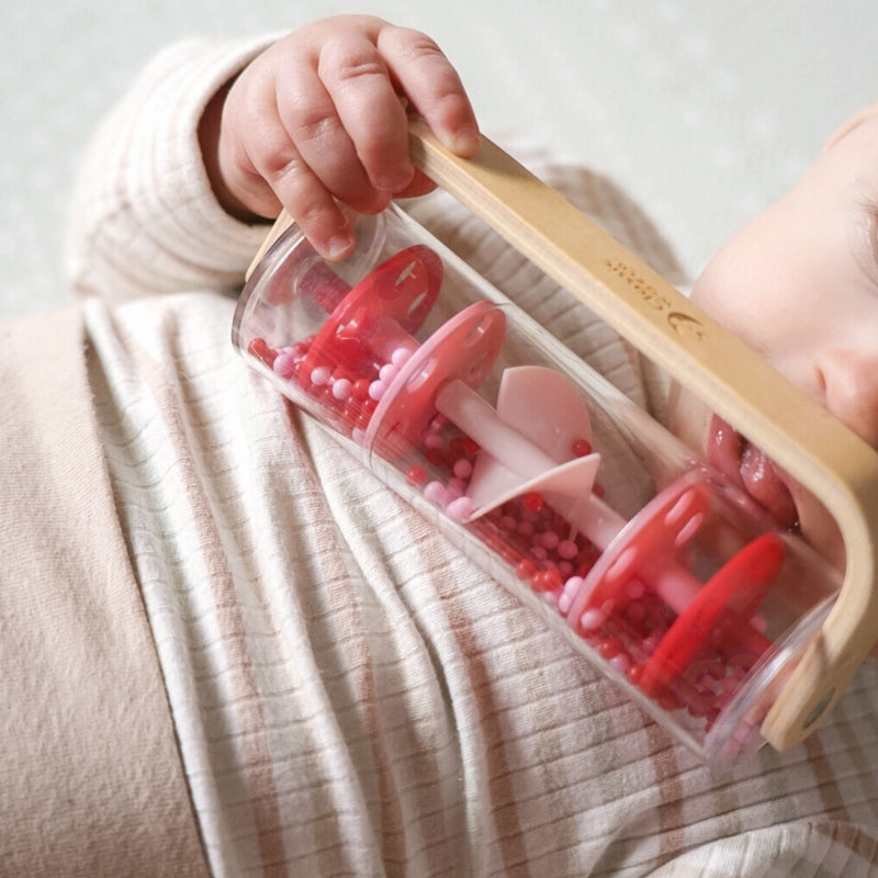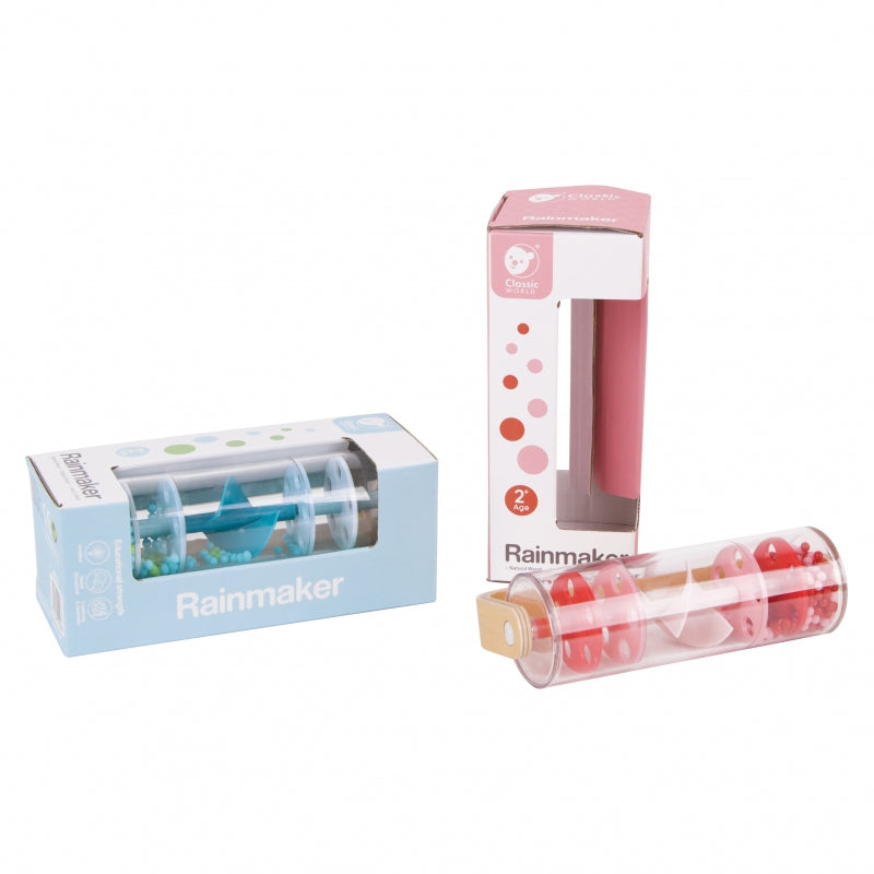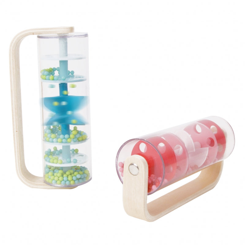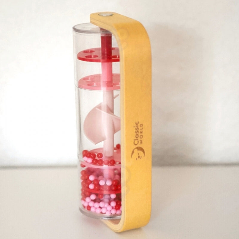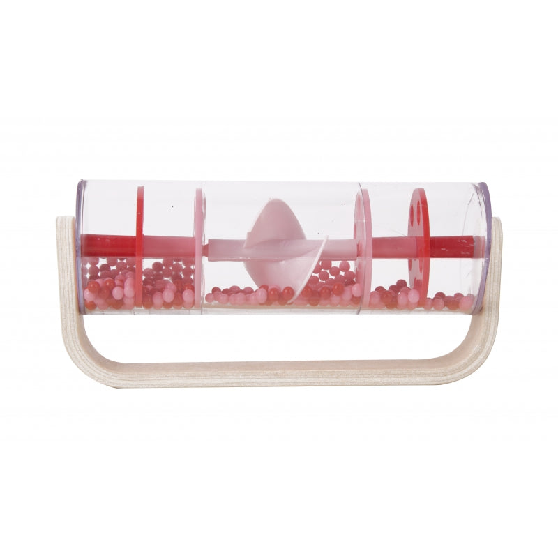 Barškutis su kamuoliukais sudaro raminantį lietaus garsą. Purtydamas ir sukdamas žaislą vaikas stebės kaip karoliukai krenta žemyn ir skleidžia įdomų garsą. Puikus žaislas jutimo vystimuisi.