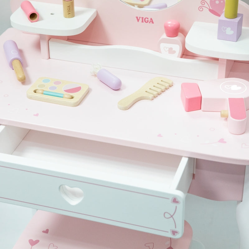 Didelis medinis tualetinis staliukas iš Viga yra unikalus staliukas vaikui, kuris išpildys kiekvieno vaiko svajones! Pagamintas iš aukščiausios kokybės medžio, švelnių rožinių ir baltų atspalvių, šis žavus tualetinis staliukas džiugina pasakišku dizainu. Stilingos, apvalios formos, subtilūs papuošimai ir elegantiškos kojos puikiai tinka vaikų kambariui, suteikdami jam žavesio ir magijos. Tualetinis staliukas ugdo kūrybiškumą, vaizduotę ir skatina vaidmenų žaidimus. Tai taip pat puiki dovana – tvirta konstrukcija ir estetiškas išvaizda užtikrins, kad jis tarnaus daugelį metų.