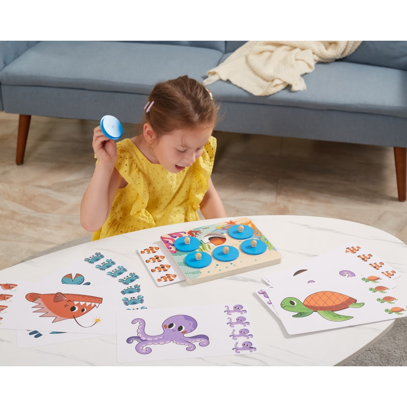 Palyginimo žaidimas puiki idėja laiko praleidimui kartu. Žaisdamas vaikas lavina atmintį ir koncentraciją, mokisis kantrybės ir dėmesio detalėms. Pratimai atminčiai puikiai laviną vaikų protą. Įkiškite kortelę į medinę lentą, paimkite ratuką už rankenėlės, pažiūrėkite į piešinį ir atspėkite, kurį iš keturių paveikslėlių atitinka paslėptas gyvūnas. Jei nepavyksta atspėti, paimkite kitą ratą, po kuriuo nurodyta informacija.