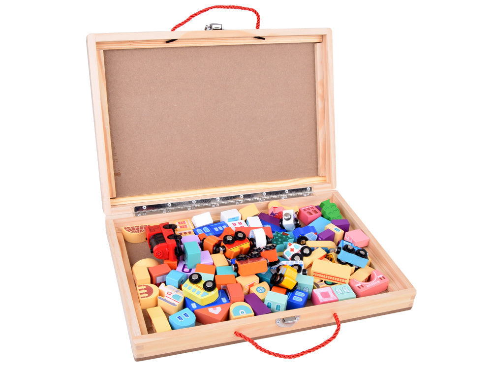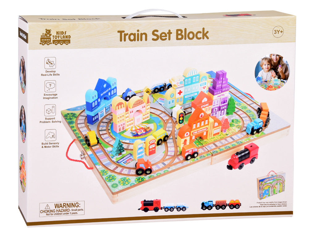 Medinis kaladėlių rinkinys vaikams su traukiniu ir priedais 89 el.