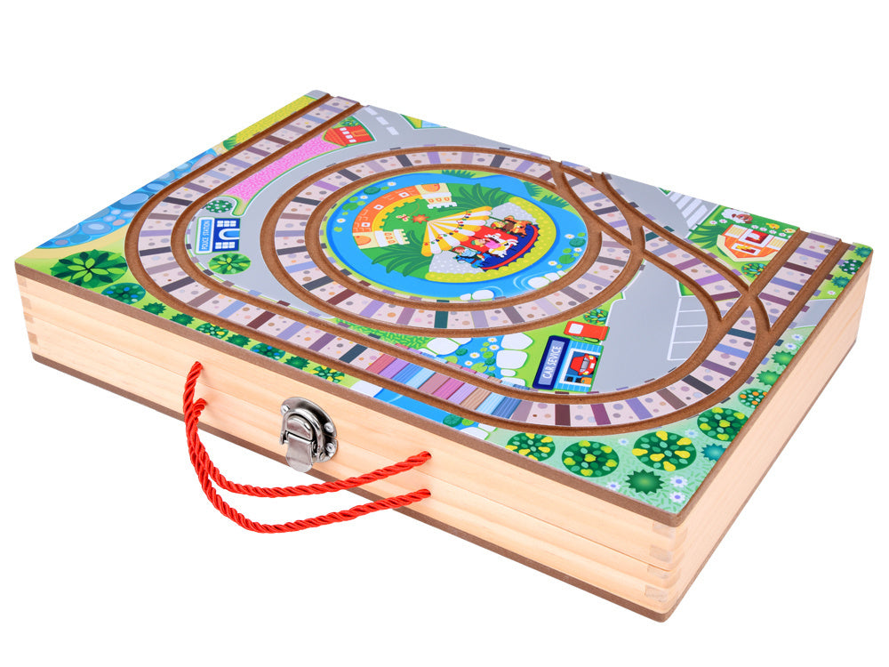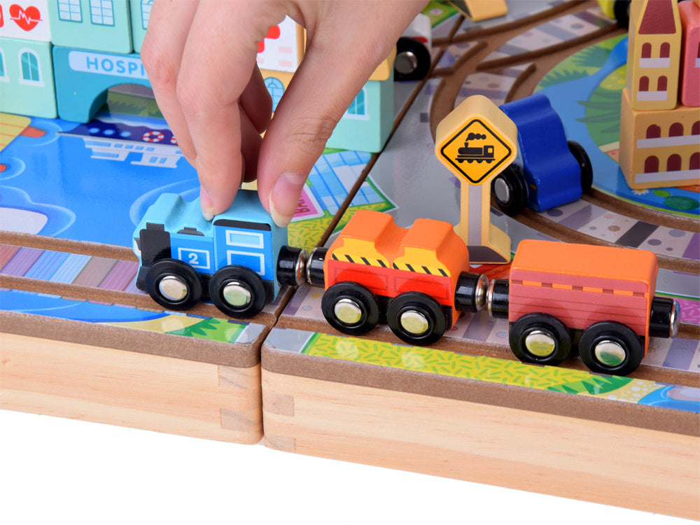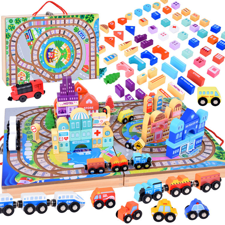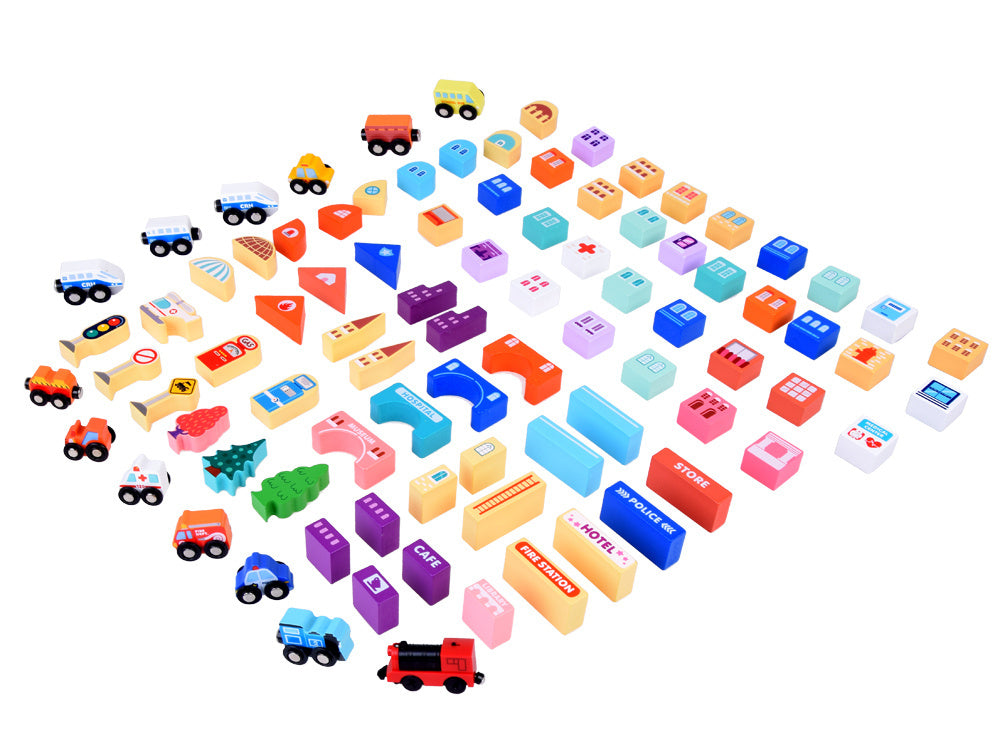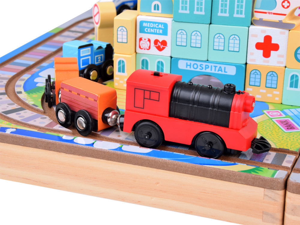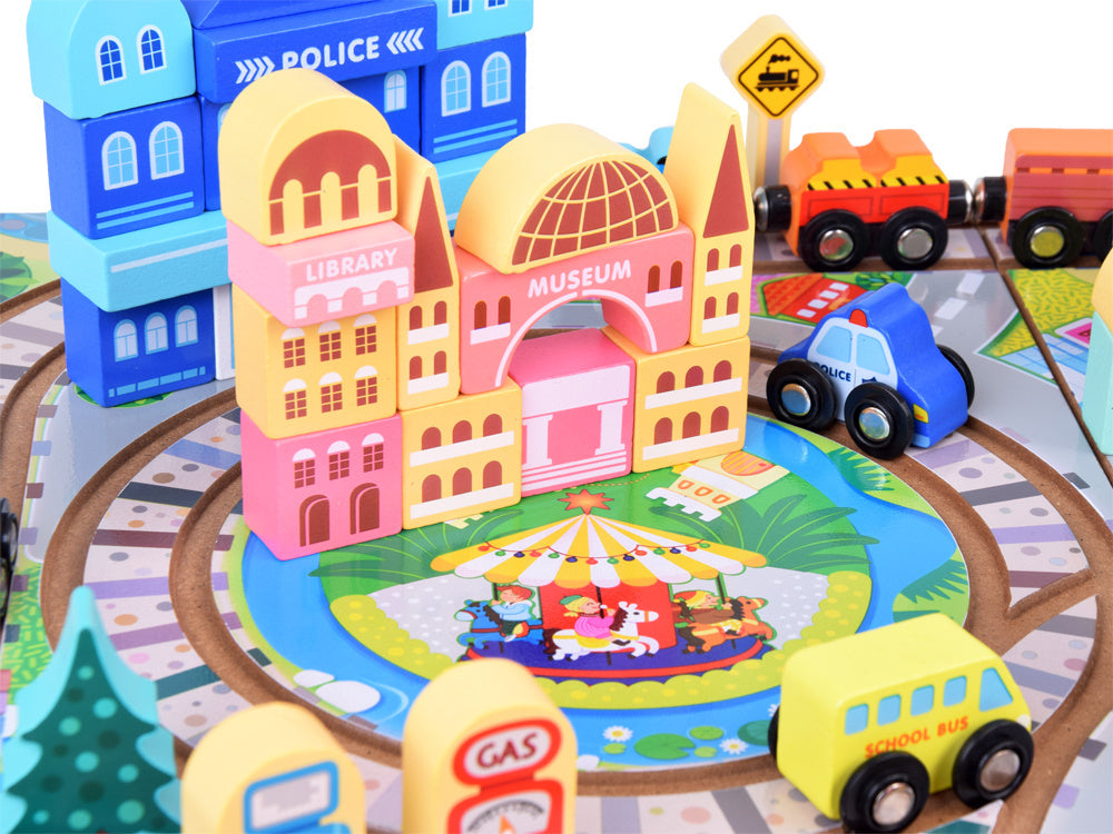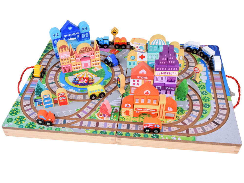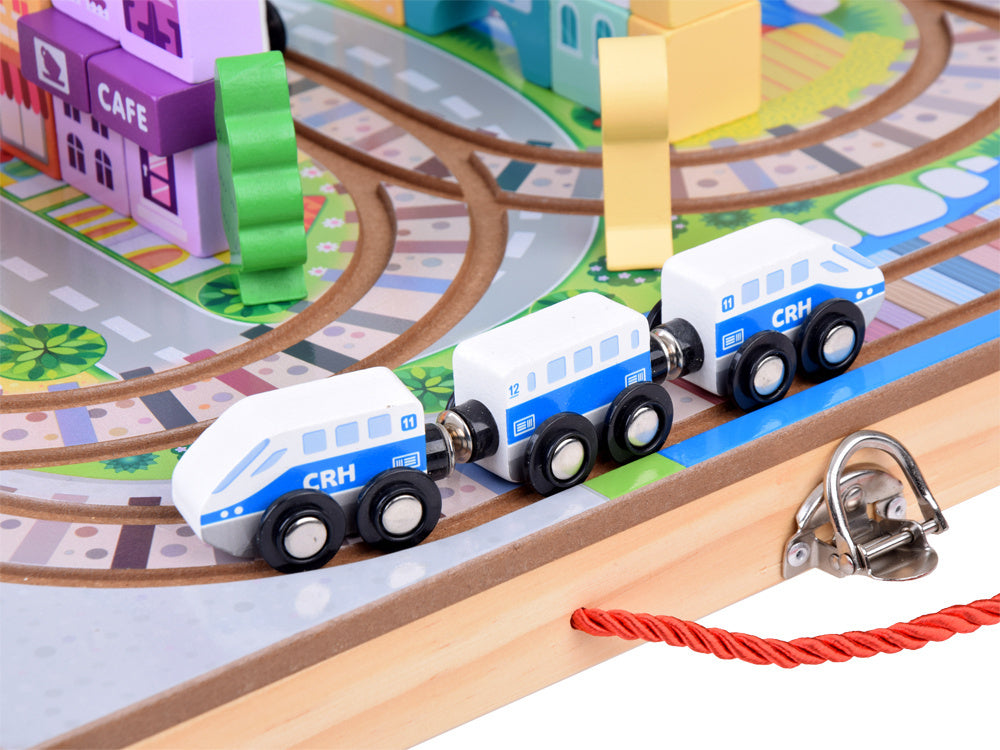 Atraskite žavų kelionių geležinkeliu pasaulį su šiuo medinių kaladėlių rinkiniu, kuris nukels jūsų vaiką į stebuklingą nuotykių kupiną miesto pasaulį! Rinkinį sudaro 89 dalys, įskaitant bėgius, baterijomis varomą traukinuką ir įvairias kaladėles, iš kurių galima sukurti unikalius pastatus ir atrakcionus. Drąsiai tyrinėkite geležinkelio nuotykių ir begalinių konstravimo galimybių pasaulį!