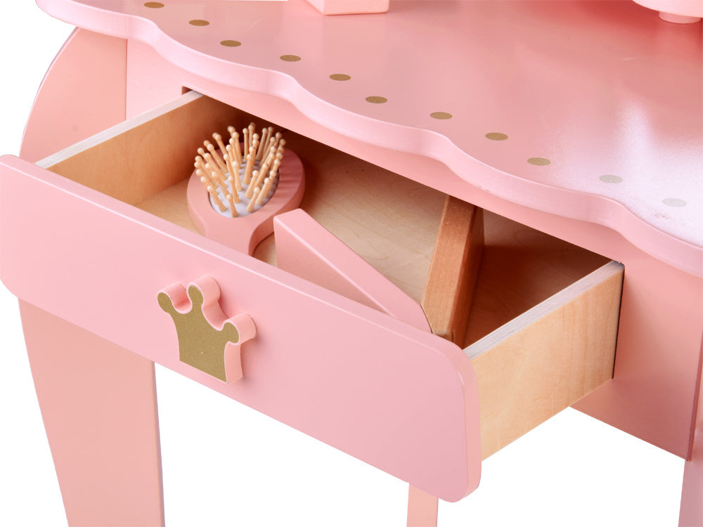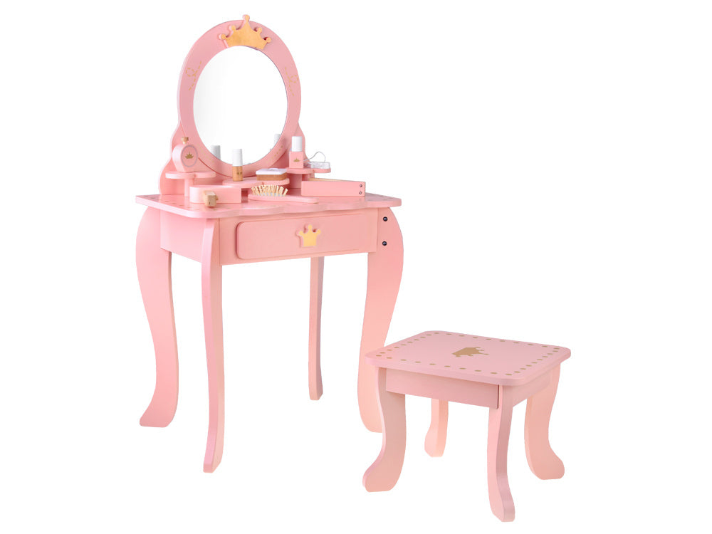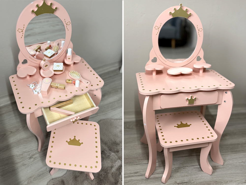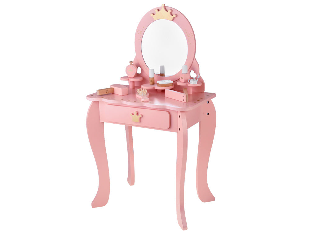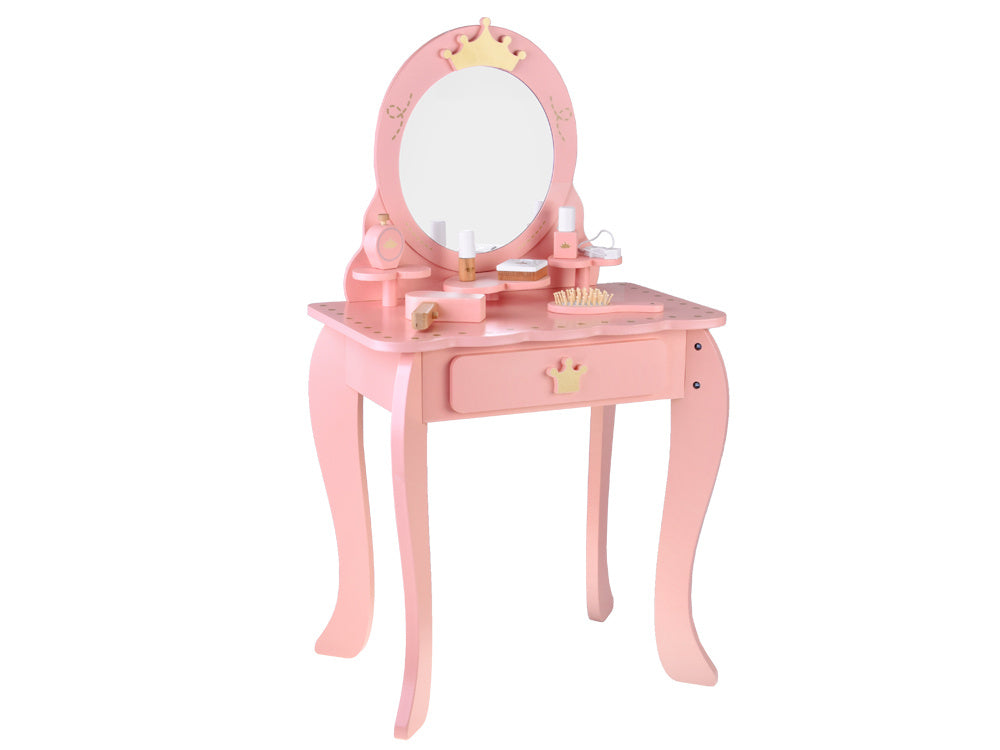 Elegantiškas, karališkas tualetinis staliukas pastelinių rožinių spalvų su auksiniais akcentais yra kiekvienos mažos princesės svajonių baldas. Jis bus žavinga bet kurios kambario dekoracija ir praktiškas kampelis žaidimams, mados stiliaus kūrimui ir makiažo malonumams.