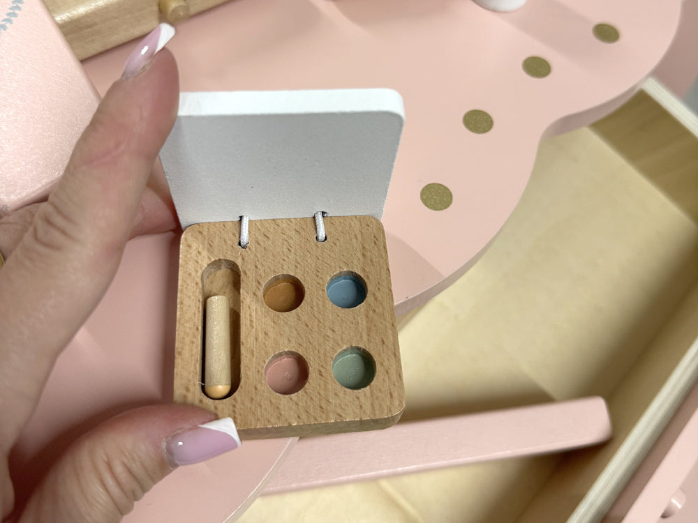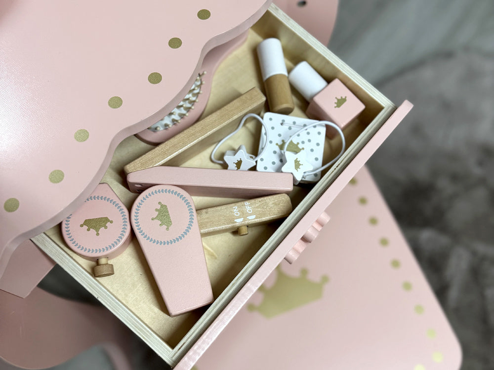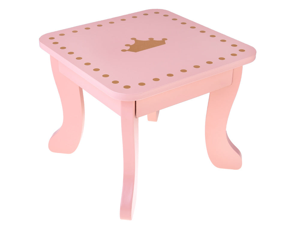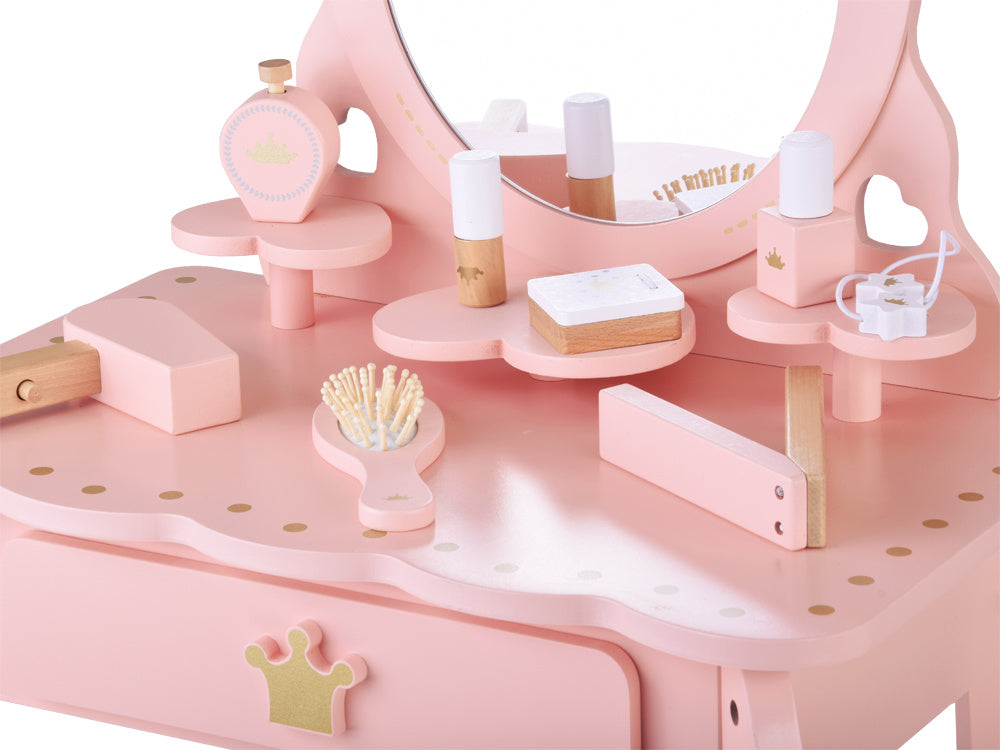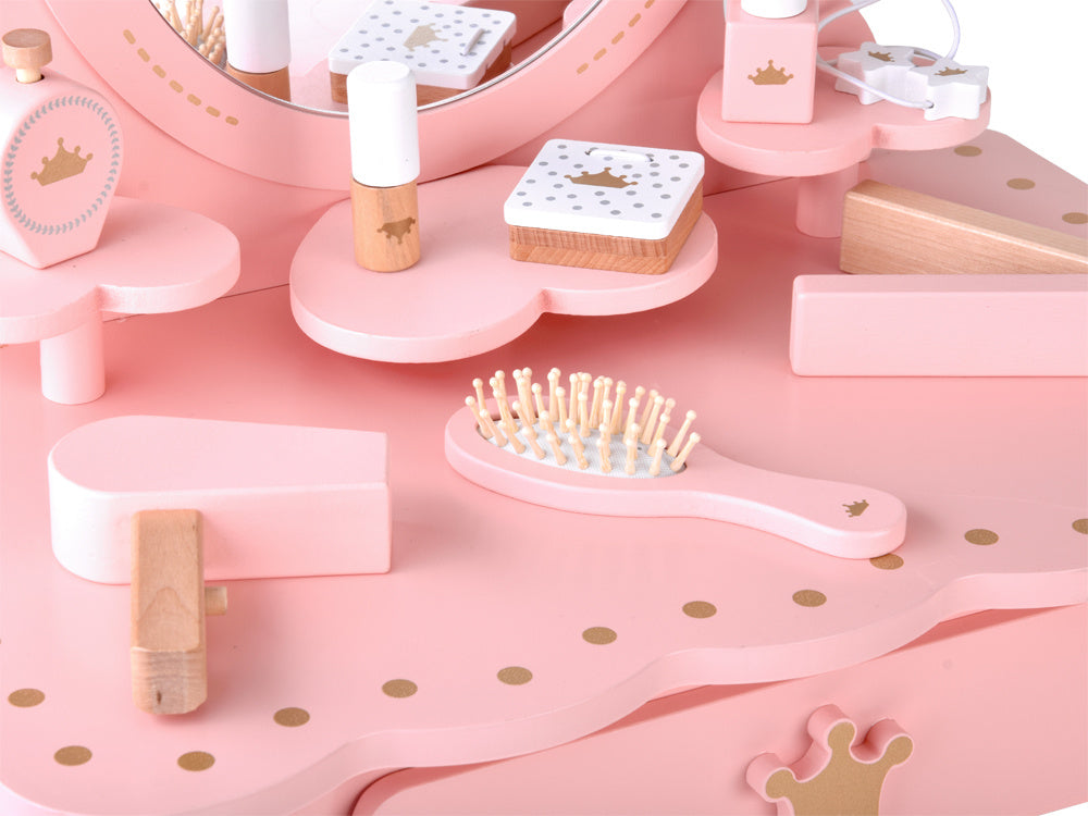 Elegantiškas, karališkas tualetinis staliukas pastelinių rožinių spalvų su auksiniais akcentais yra kiekvienos mažos princesės svajonių baldas. Jis bus žavinga bet kurios kambario dekoracija ir praktiškas kampelis žaidimams, mados stiliaus kūrimui ir makiažo malonumams.