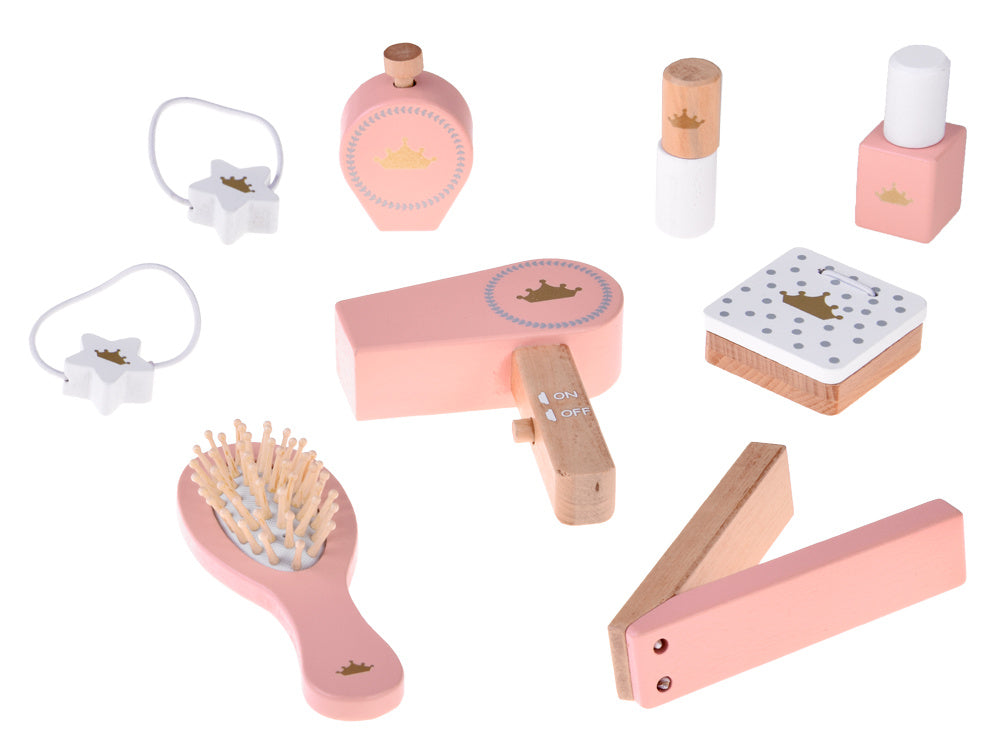 Medinis karališkas kosmetinis staliukas su veidrodžiu, kėde ir aksesuarais