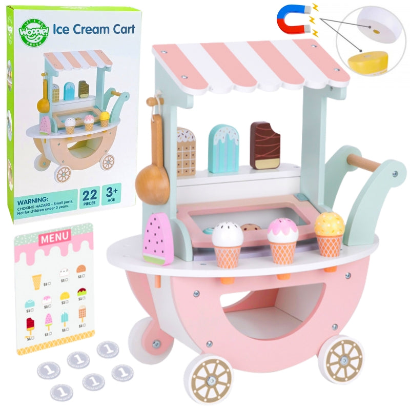 WOOPIE prekės ženklo GREEN serijos medinė ledų parduotuvė „3-in-1“ yra puikus žaislas bet kuriam vaikui. Žaviame mediniame vežimėlyje sujungtos ledų salono, konditerijos ir parduotuvės funkcijos, todėl vaikai galės valandų valandas žaisti kūrybiškai ir tobulėti. Rinkinys išsiskiria gausia įranga ir dėmesiu detalėms, todėl puikiai tiks vaidmenų ir vaizduotės žaidimams.