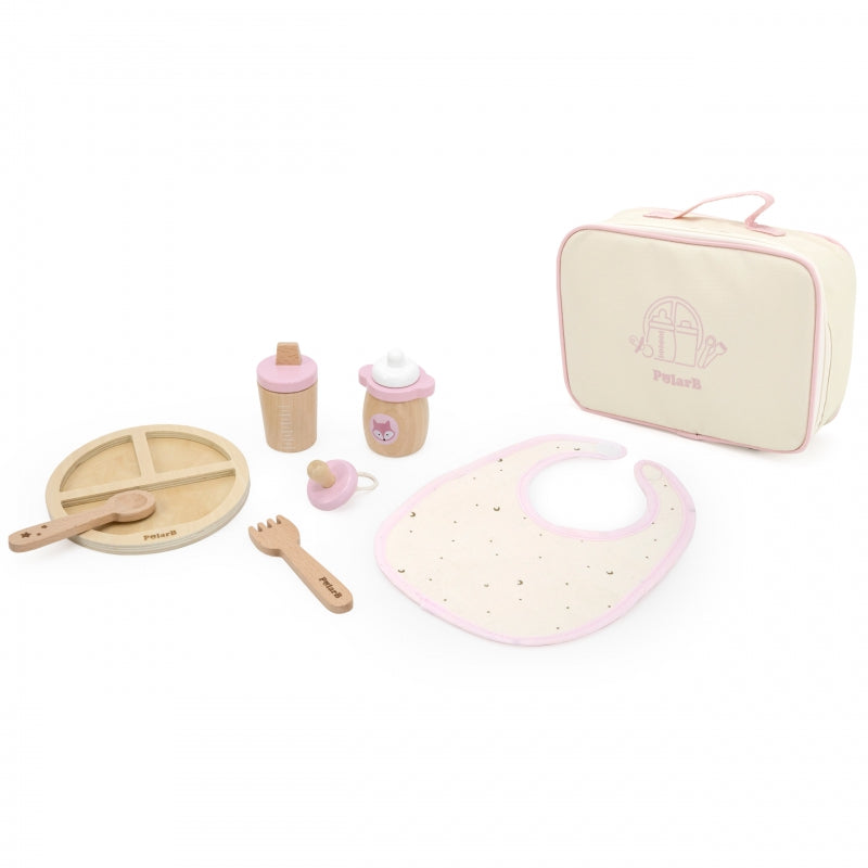 Žavus medinių lėlių maitinimo rinkinys iš Viga PolarB asortimento - puikus būdas ugdyti vaikų meilės ir rūpesčio jausmą žaidžiant vaidmeninius žaidimus. Tai ne tik žaislas, bet ir priemonė, padedanti vaiko emocinei ir socialinei raidai. Visos dalys patogiai supakuotos į užtrauktuku užsegamą maišelį, todėl rinkinį lengva laikyti ir transportuoti. Maišelyje yra viskas, ko reikia mylimai lėlei prižiūrėti - nuo šliaužtinuko iki buteliuko. Su šiuo rinkiniu mažieji gali prižiūrėti savo lėles ir kartu mokytis atsakomybės, empatijos ir rūpinimosi kitais. Tai puikus būdas lavinti vaizduotę ir kūrybiškumą kuriant įvairius žaidimų scenarijus.