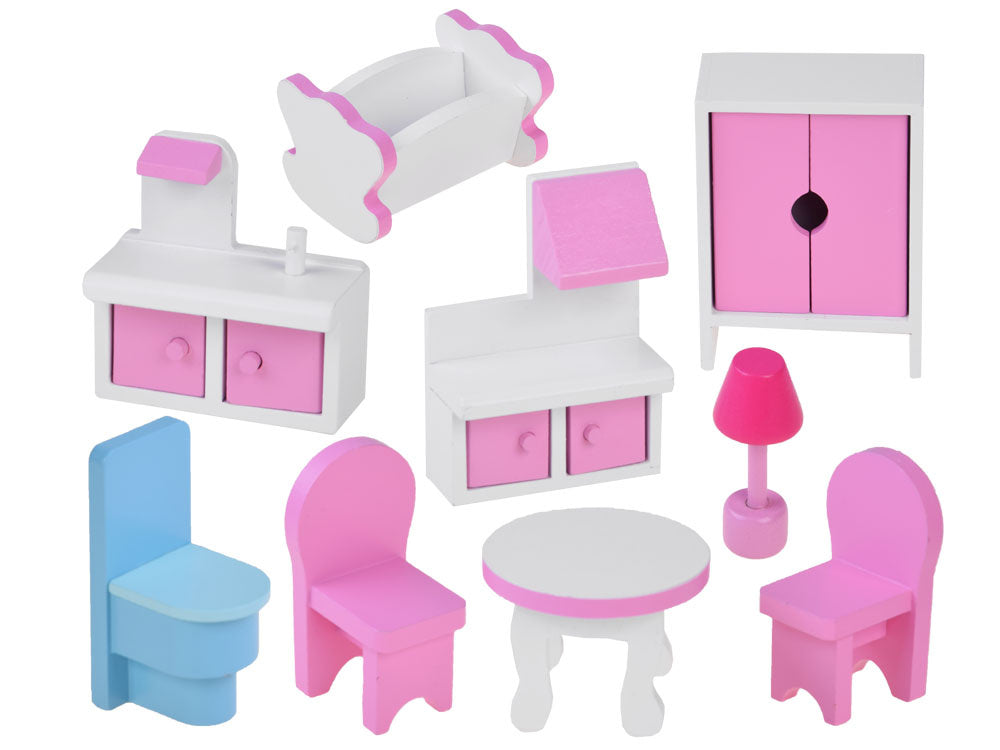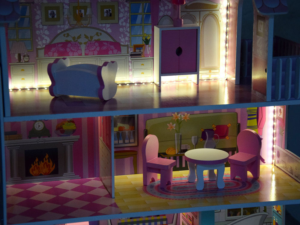 Medinis lėlių namelis su baldais ir led šviesa