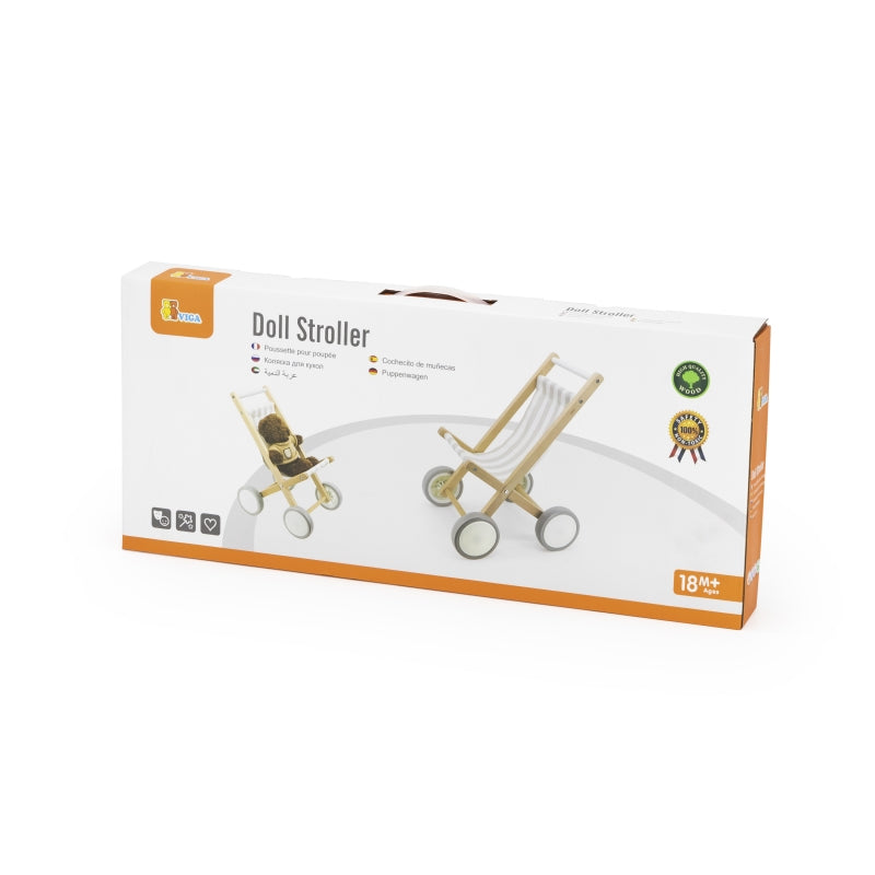 VIGA prekės ženklo medinis vežimėlis lėlėms, pagamintas iš buko masyvo, su dideliais plastikiniais ratais ir guminėmis neslystančiomis padangomis. Jis tinka ne didesnėms kaip 38 cm dydžio lėlėms.