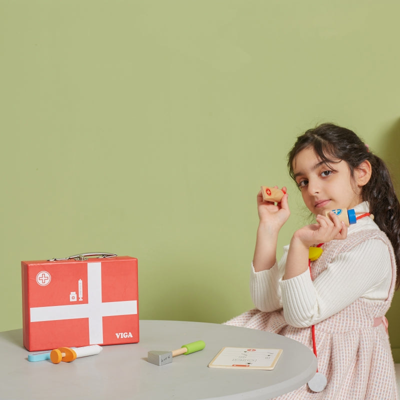 Metas pradėti žaisti gydytoją. Mediniame lagaminėlyje vaikas ras visus reikmenis, reikalingus kiekvieno tikro gydytojo darbui. Vaikas galės sugalvoti scenas, skatindamas savo vaizduotę ir kūrybiškumą, padėti sergantiems meškiukams ir lėlėms, taip ugdydamas emocinį intelektą, jautrumą ir empatiją. Be viso to, kiekvienas vaikas supras, kad nereikia bijoti gydytojo, o švirkštai ir kartais negražūs sirupai leidžiami jų pačių labui.