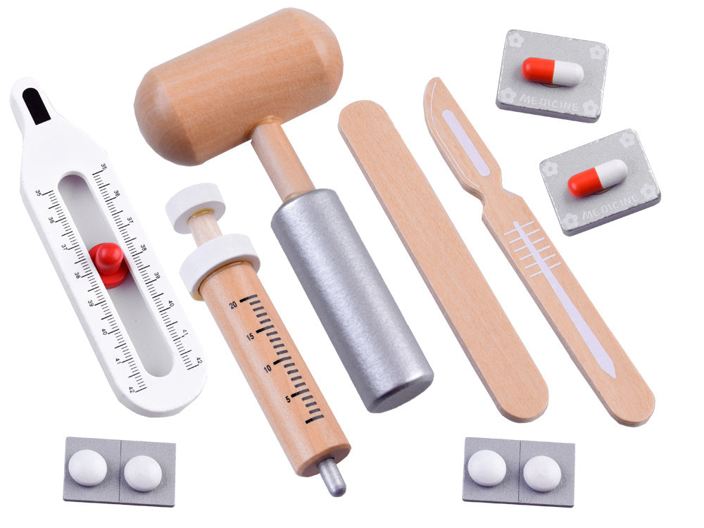 - Priedai daugiausia pagaminti iš medžio, išskyrus plastikinį ženkliuką ir stetoskopą