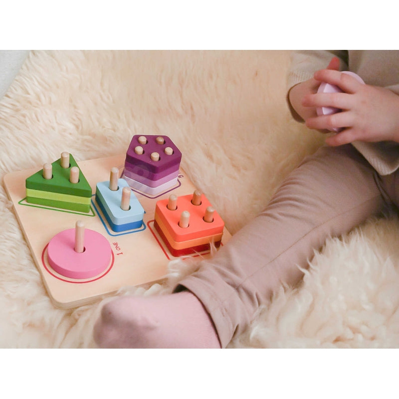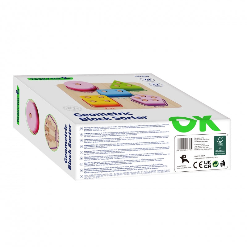TOOKY TOY Medinis geometrinis rūšiuoklis yra mokomasis žaislas, skirtas skaičiavimo, formų ir spalvų mokymuisi. Atitinkamos formos turi būti padėtos ant kiekvieno iš penkių kaiščių, o šio, atrodytų, paprasto žaidimo sudėtingumas slypi tame, kad blokai turi būti suderinti su atitinkamais kaiščiais. Medinėje bazėje taip pat yra 5 skaičiai ir figūrų pavadinimai anglų kalba, o tai yra puiki užsienio kalbos pažintis jūsų mažyliui. Žaisdamas vaikas lavina rankų įgūdžius, rankų ir akių koordinaciją bei loginį mąstymą.