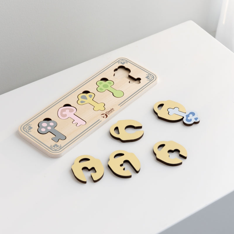 Medinė sensorinė dėlionė su raktais ir spynomis puikus galvosūkis vaikui. Žaidime reikia suderinti penkis unikalius raktus su vienodomis spynomis, raktai taip pat gali būti paslėpti lentoje, kurioje yra vietos kiekvienam raktui. Puikiai tinka mažų vaikų rankų ir akių koordinacijos, motorikos lavinimui bei grafiniam pažinimui.