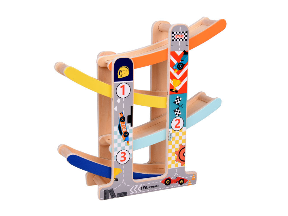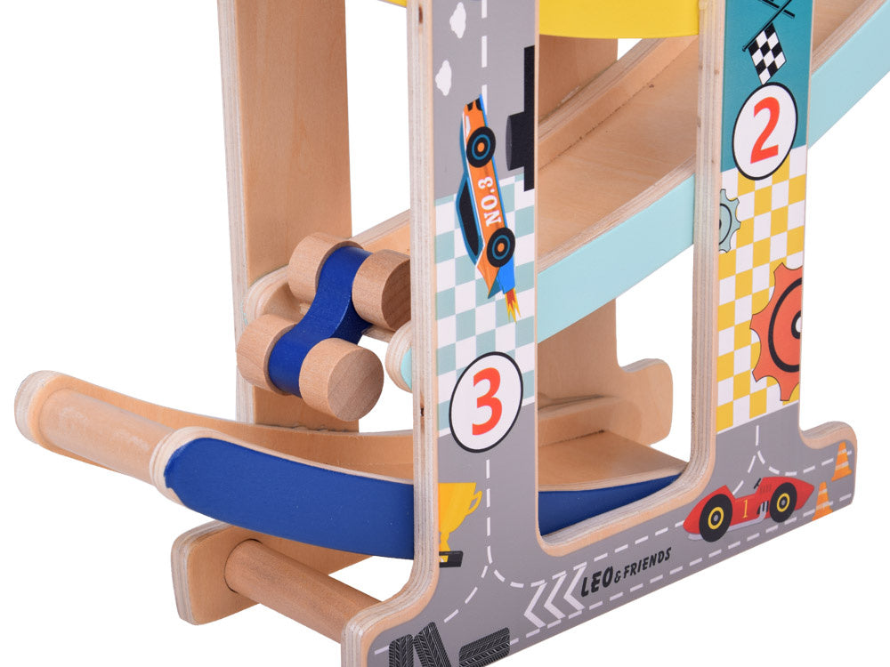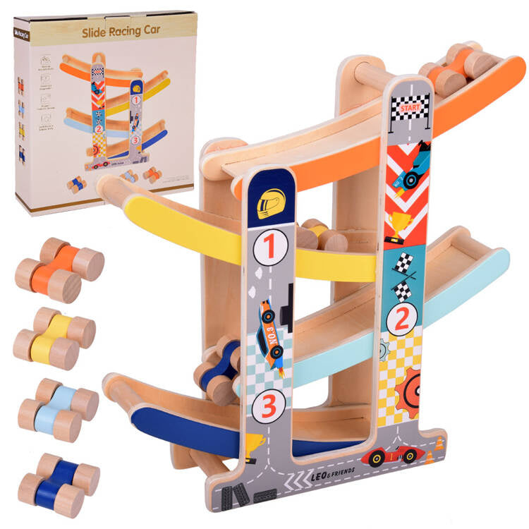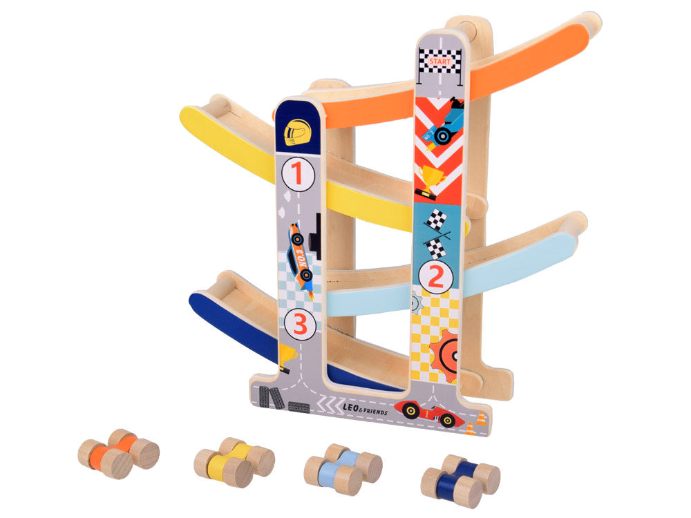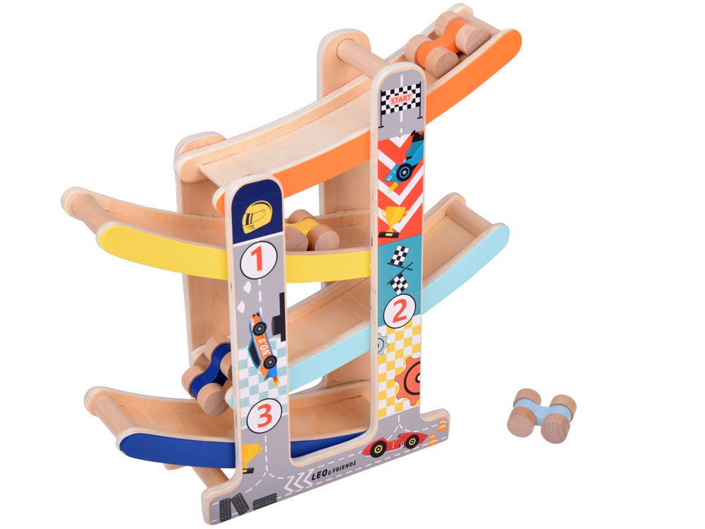 Medinis automobilių nusileidimo takas - spalvinga pramoga kuri lavina ir džiugina! Leiskite savo vaikui patekti į automobilių pramogų pasaulį! Medinis automobilių kalnelis yra idealus lavinamasis žaislas, lavinantis rankų darbo įgūdžius, mokantis spalvų, loginio mąstymo ir skatinantis kūrybiškai žaisti.
