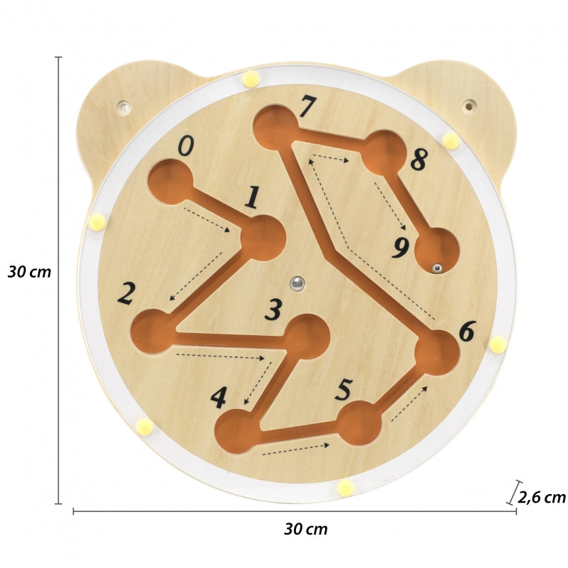 Viena iš medinių plokštelių serijos su miela meškiuko galva. Dėl besisukančio ratuko lenta leidžia plieniniam rutuliui pasiekti kiekvieną skaitmenį nuo 0 iki 9. Žaislas padeda lavinti rankų ir akių koordinaciją, mokytis skaičiuoti ir gebėjimą spręsti problemas, o tai yra labai svarbu vėlesniame kiekvieno žmogaus gyvenime jaunas žmogus. Produktas puikiai tiks tiek namuose, tiek švietimo ir ankstyvojo ugdymo įstaigose. Įdomus lentos formos paruošimas tikrai patrauks kiekvieno vaiko dėmesį. Visa tai pagaminta iš lakuotos medienos ir nudažyta netoksiškais ryškių spalvų dažais, kurie patenkins kiekvieną vartotoją ir suteiks daug malonumo. Produktas skirtas vaikams nuo 18 mėnesių. Mūsų pasiūlymas apima visą seriją meškos galvos lentų.