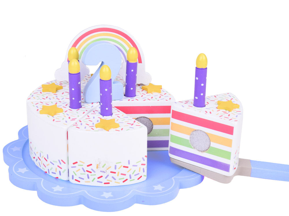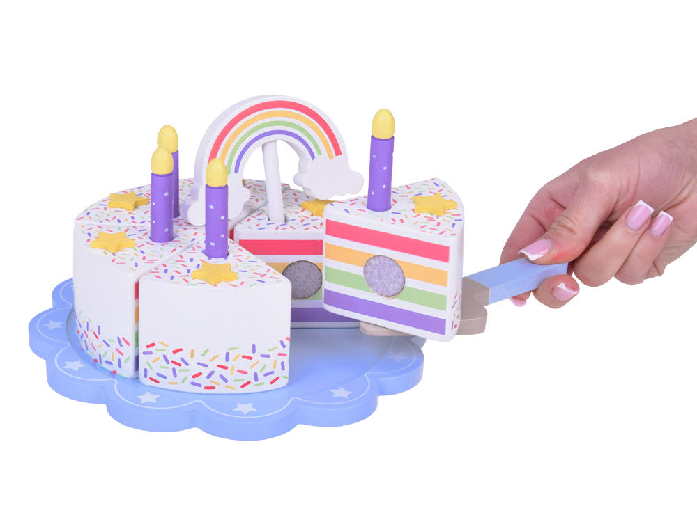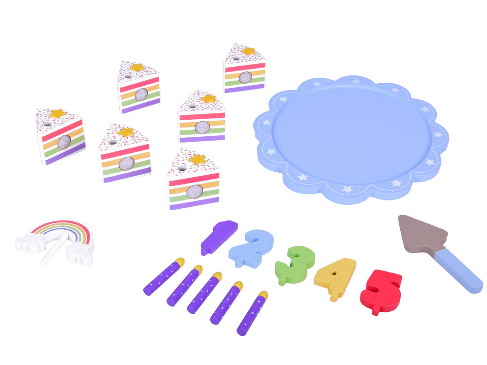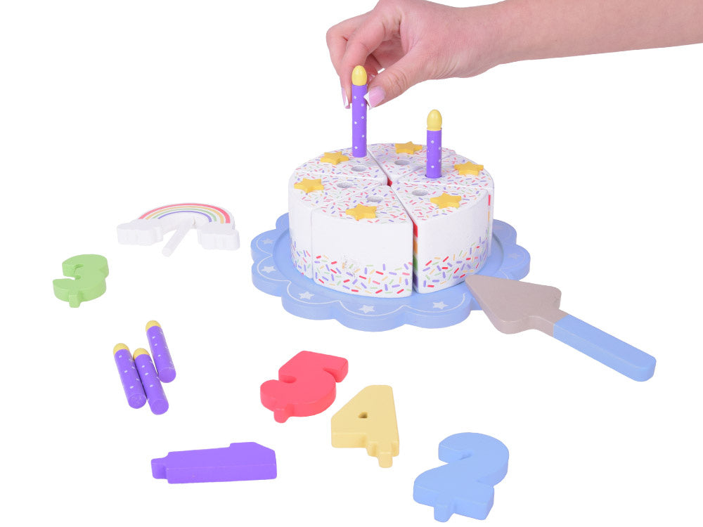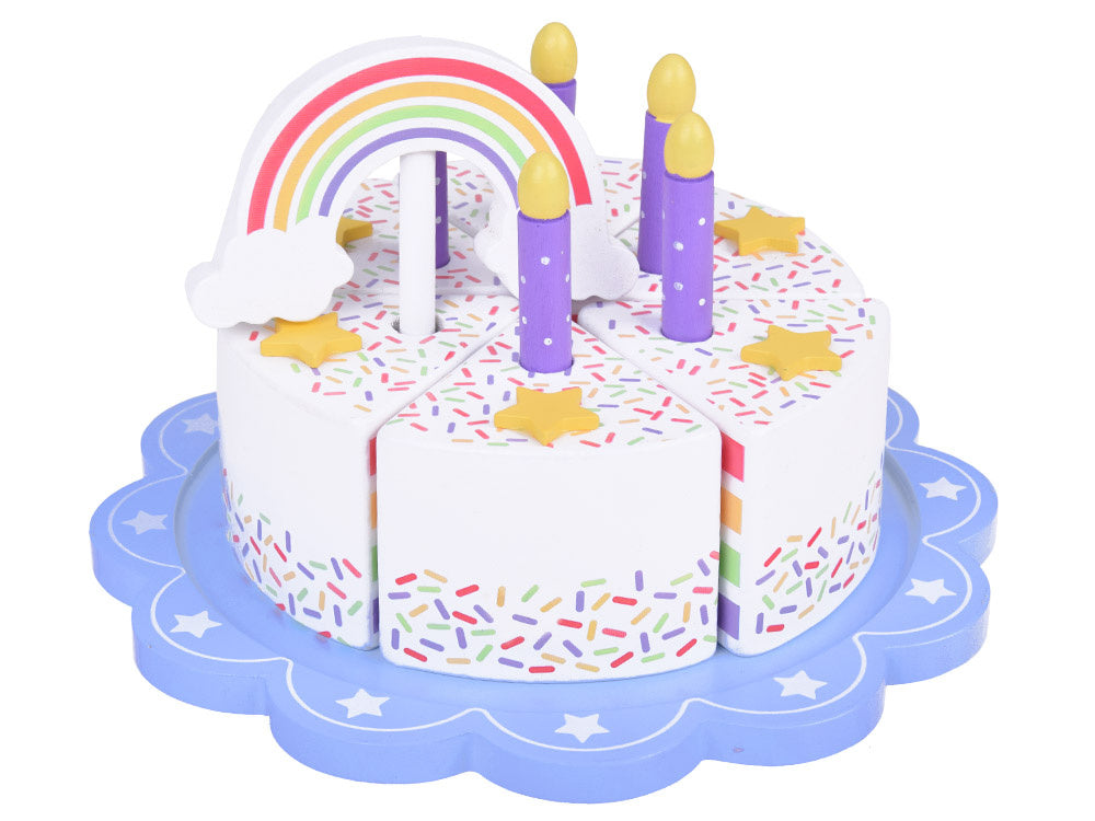 Šis fantastiškai pagamintas gimtadienio tortas puikiai tiks bet kokiam lėlių ir meškiukų vakarėliui! Spalvingas šešių dalių tortas yra puiki tikro torto imitacija, kurią vaikas gali pjaustyti, dalyti ir patiekti mentele. Torto viršus papuoštas nuimama spalvinga vaivorykšte, kuri suteikia visumai žavesio. Kiekviename torto gabalėlyje yra speciali vieta žvakei, todėl jis idealiai tinka žaisti per gimtadienio vakarėlius.