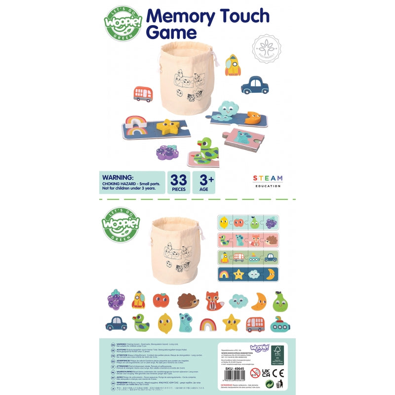 "Woopie" prekės ženklo stalo žaidimas "Touch and Find" yra puikus stalo žaidimas visai šeimai. Žaidimas ne tik smagus , bet ir puikiai lavina vaikų motorinius įgūdžius per unikalius sensorinius iššūkius. Žaidimo metu reikia surasti reikiamą medinį objektą drobės maišelyje, žaidėjas turi naudoti tik lytėjimo pojūtį, kad surastų norimą formą. Turėdami daugybę pasirinkimo variantų, galite lengvai reguliuoti sudėtingumo lygį, kad jis atitiktų kiekvieno žaidėjo amžių ir gebėjimus.