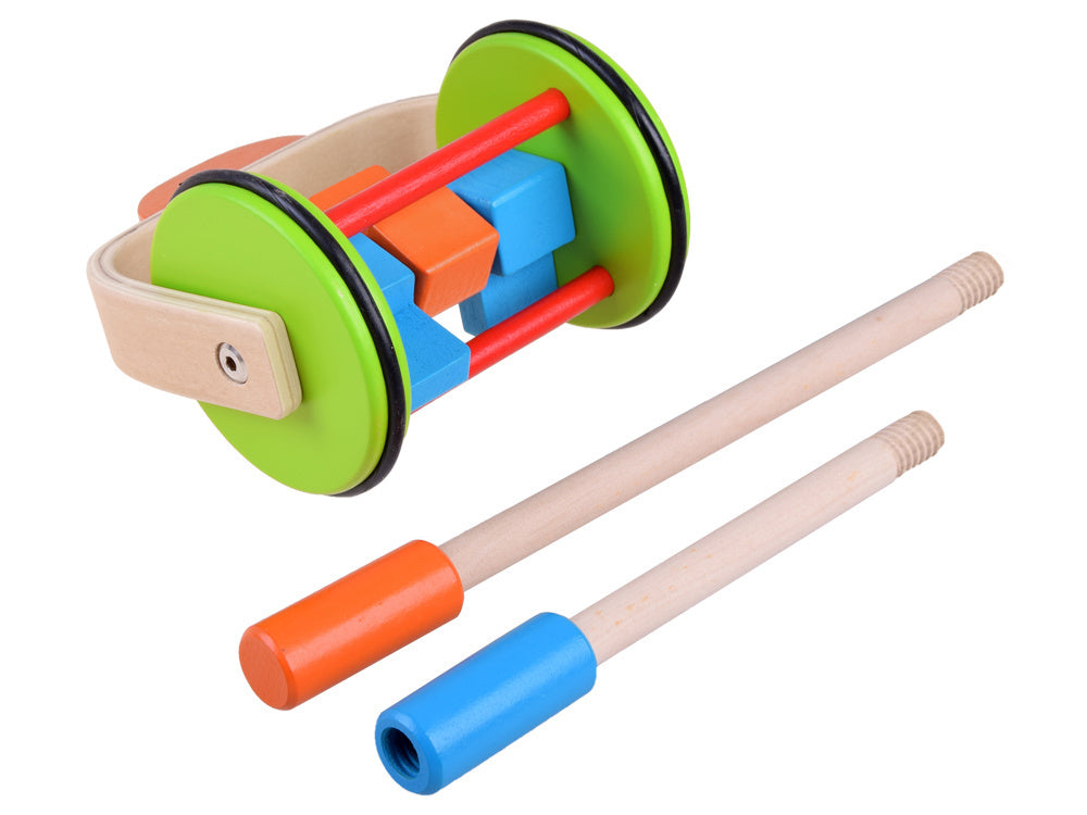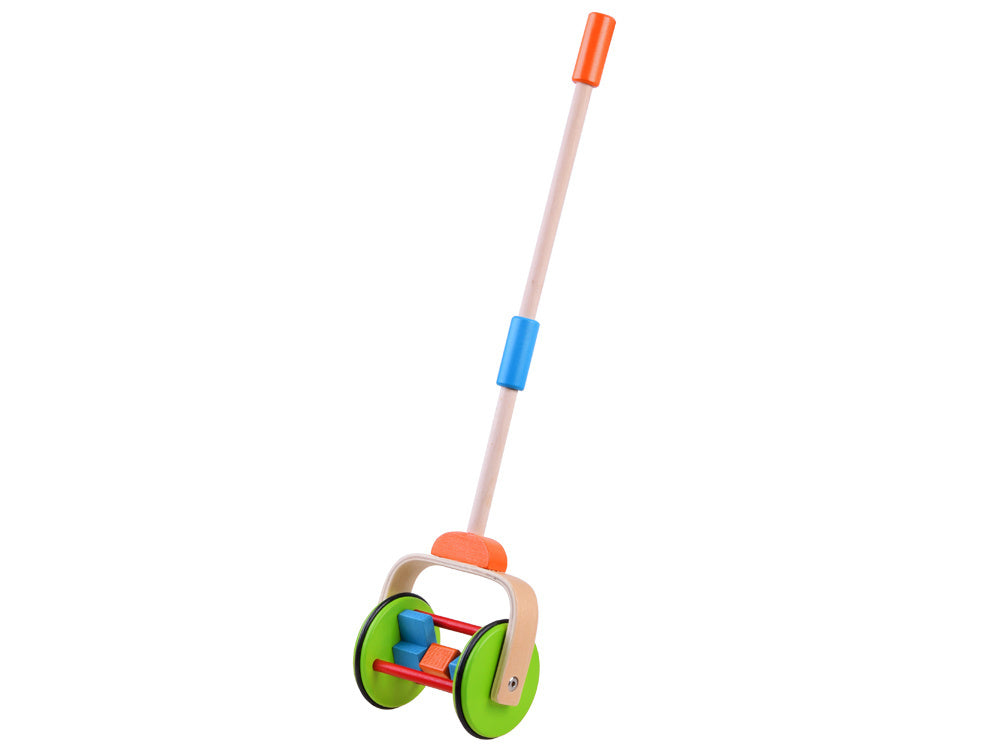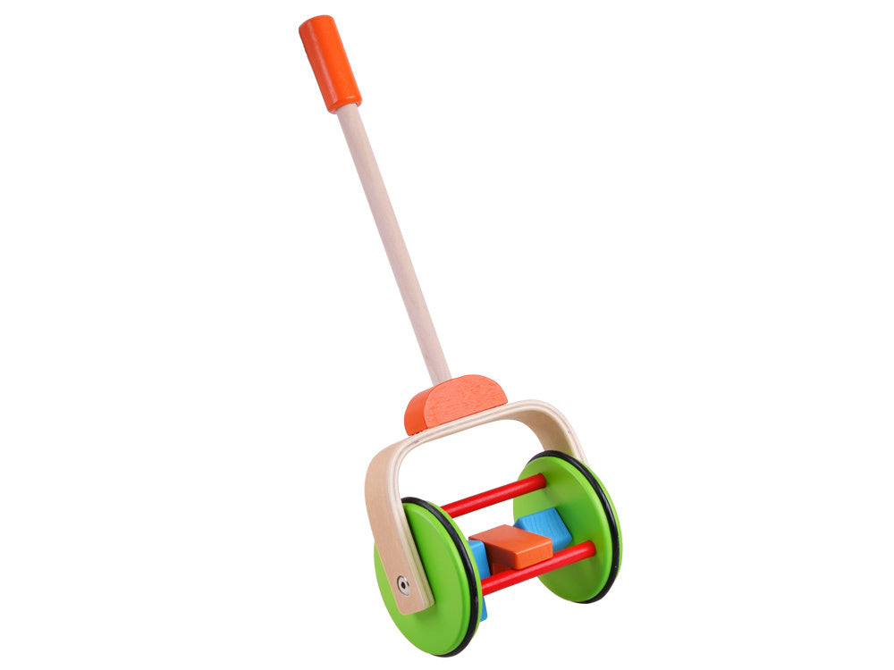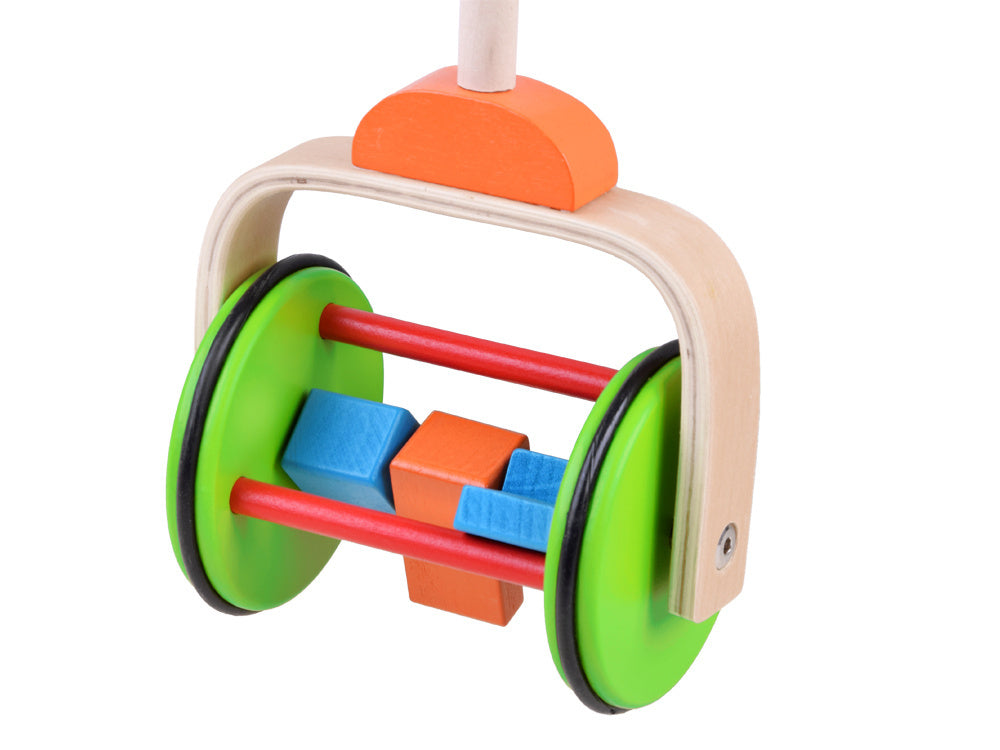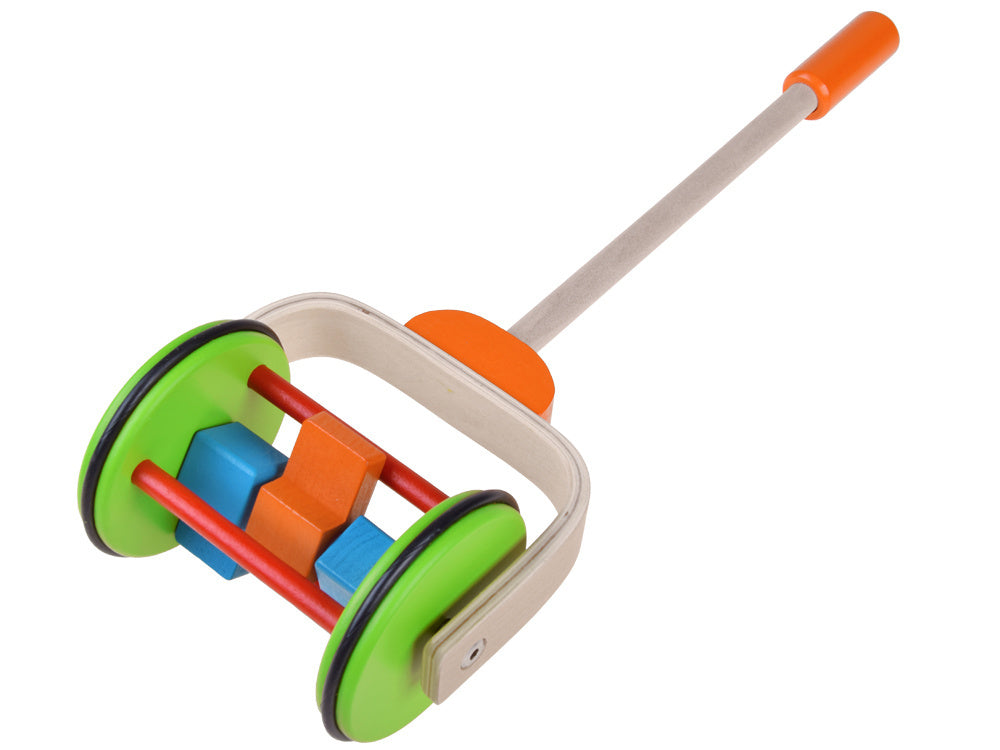 Spalvingas medinis stumdomas žaislas vaikui – pasiūlymas kiekvienam savo nuotykius nuo vaikščiojimo pradedančiam vaikui. Ant rankenos esantis volelis linksmai sukasi aplink savo ašį, viduje – spalvingos kaladėlės, kurios mielai barška stumdant žaislą.