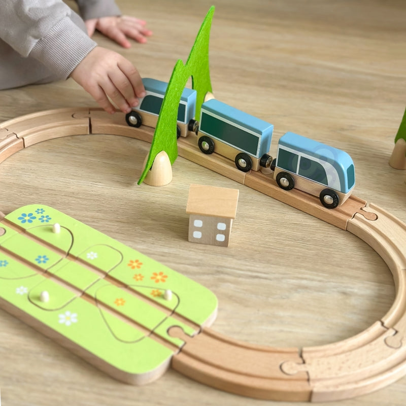 CLASSIC WORLD prekės ženklo medinis traukinio rinkinys ir jo atrakcionai su veltinio dekoracijomis kupinos staigmenų! Rinkinyje yra tunelis, stotis ir dėlionė su figūromis, kurias galima sujungti, kad būtų galima atstatyti maršrutą. Spalvingos gėlės ir paslėpti gyvūnai padės surasti reikiamas figūras. Šis traukinukas skatina kūrybiškumą, kalbos vystymąsi, smulkiąją motoriką ir koordinaciją. , o .