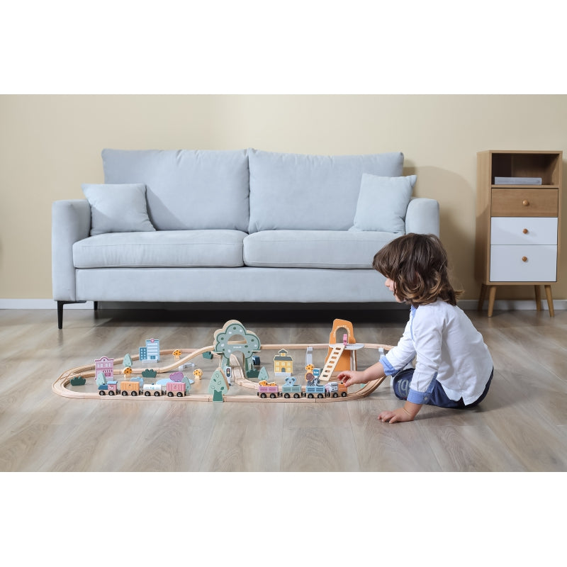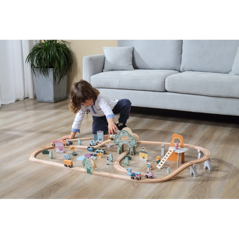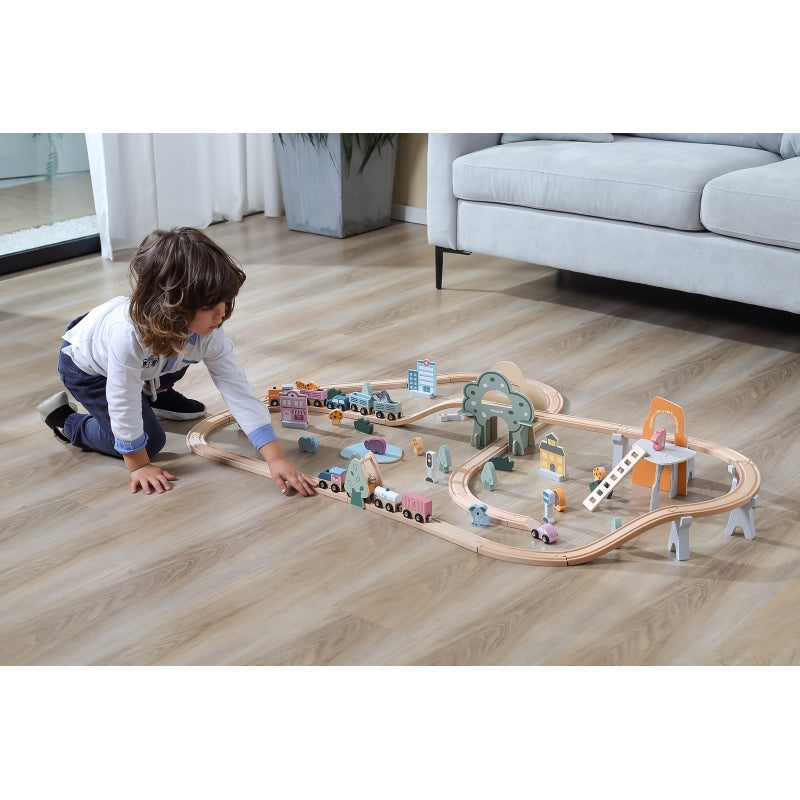 Medinis traukinukas vaikams su bėgiais ir priedais 90 el., VIGA PolarB
