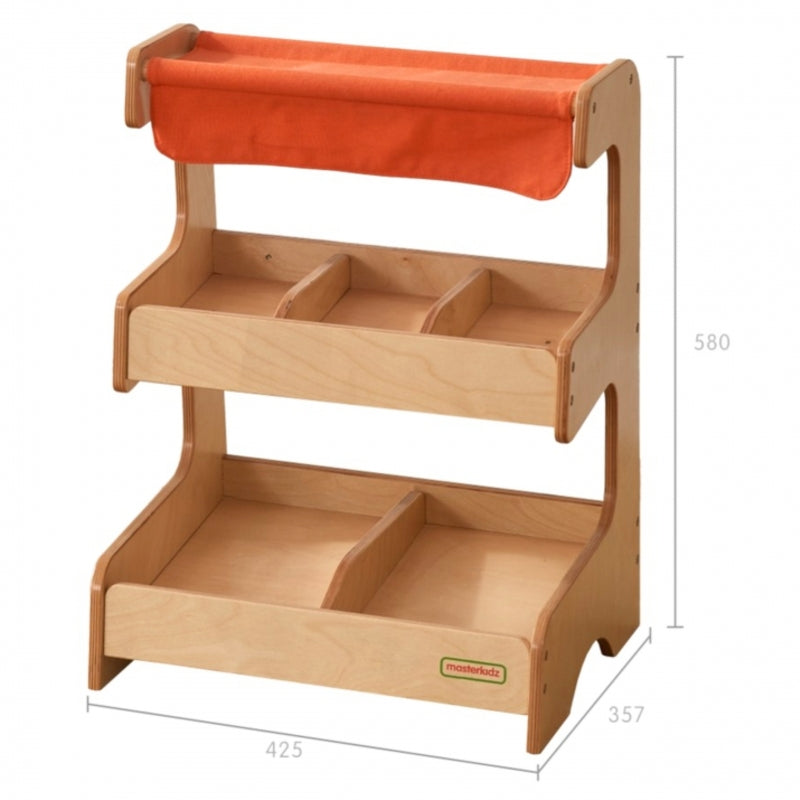 Tvirtas prekystalis medžiaginiu stogu. Jei jūsų vaikas mėgsta žaisti parduotuvėje, parduoti ir pirkti įvairius daiktus, tai bus puiki jo pramogų paįvairinimas. Žaislas yra dviejų lygių, iš kurių viename yra 3 skyriai gaminiams, o kitame – dvi, bet didesnės. Parduodamus produktus galite padalinti ir į kiekvieną skyrių užpildyti skirtingo tipo gaminiais.