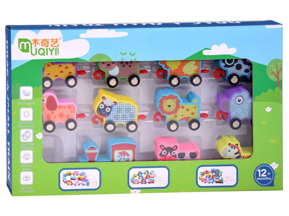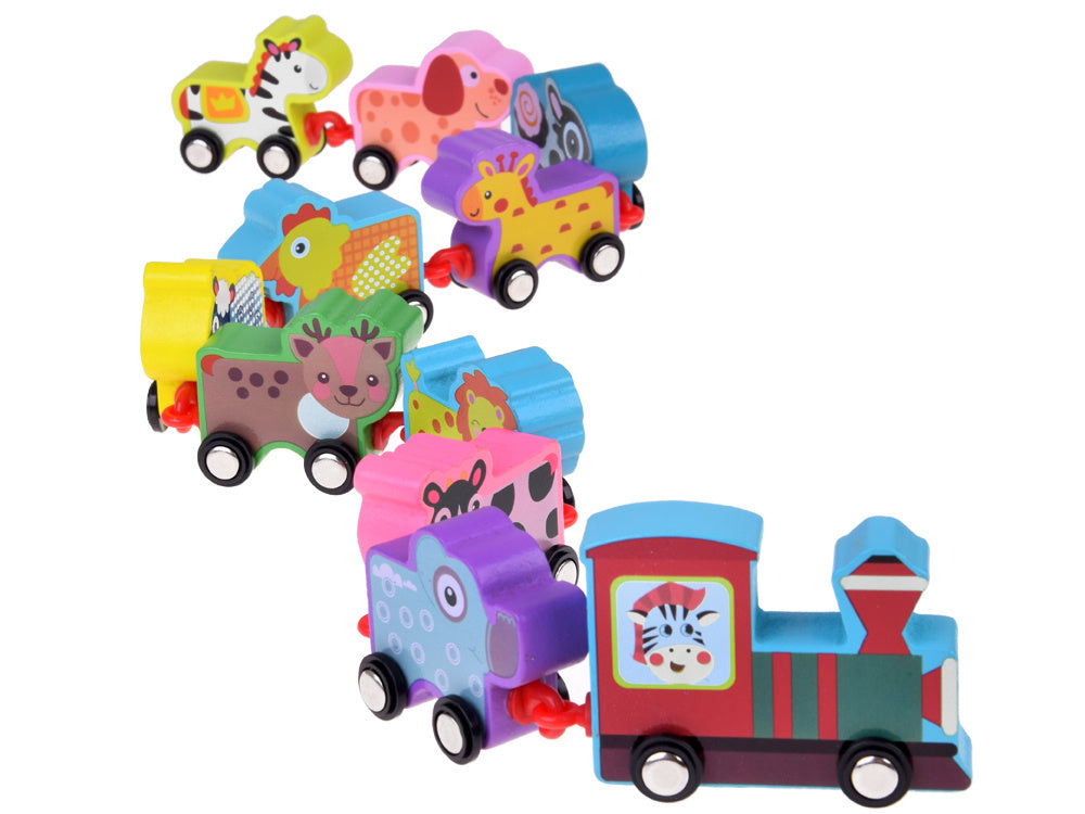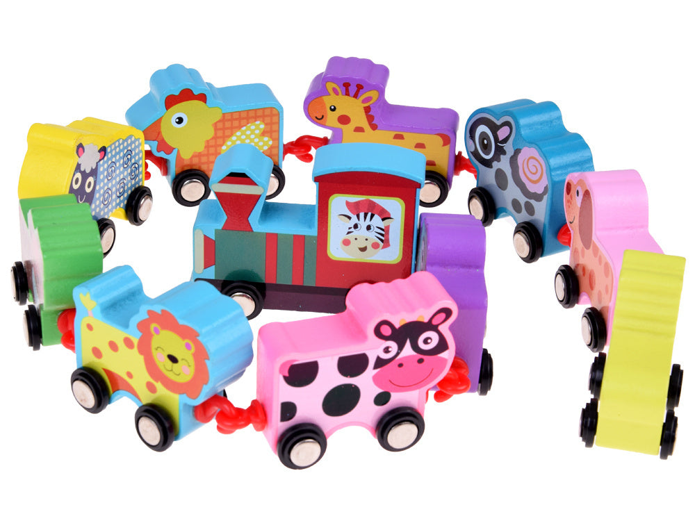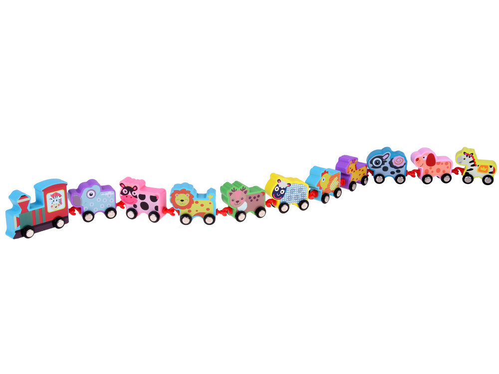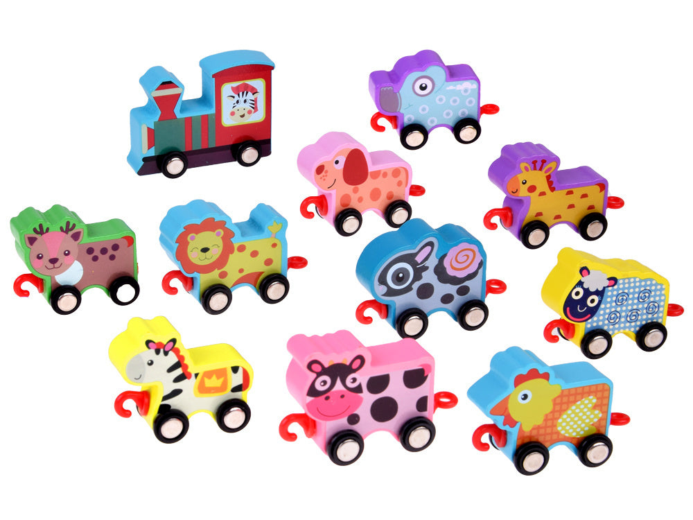 Medinis žaislinis traukinukais su gyvūnais 11 el.