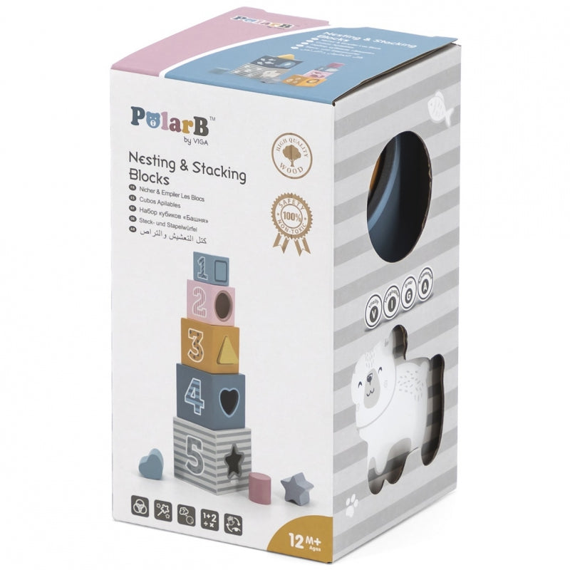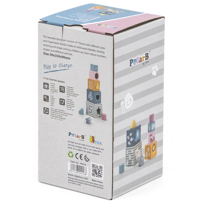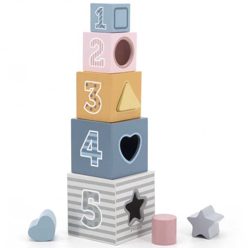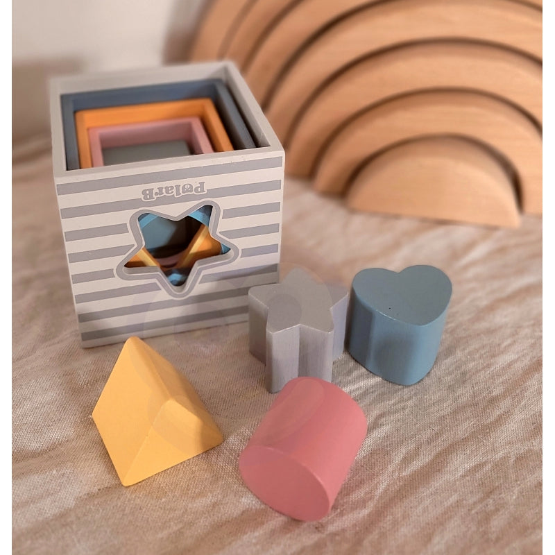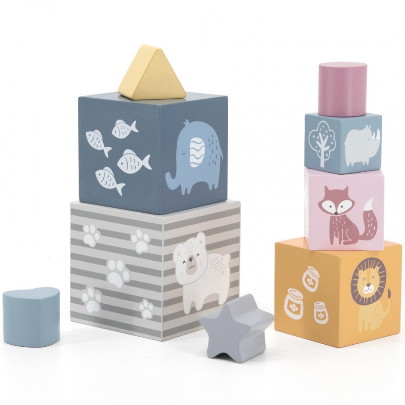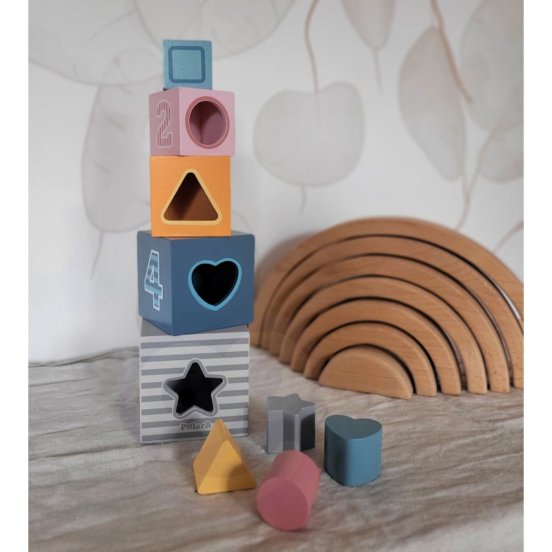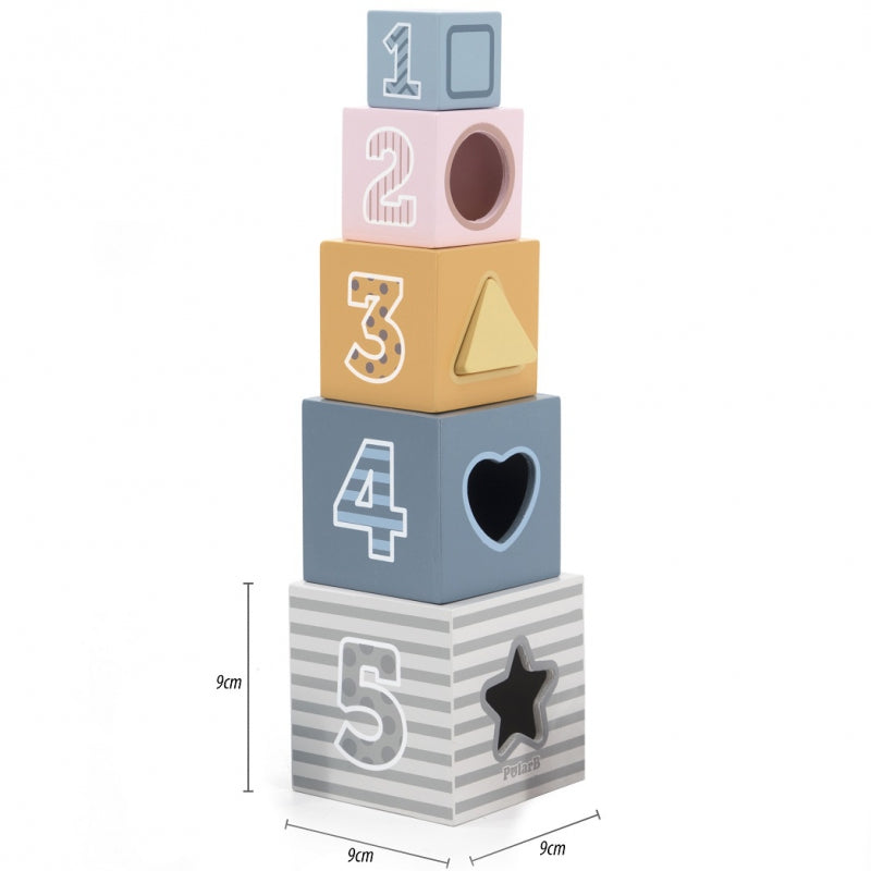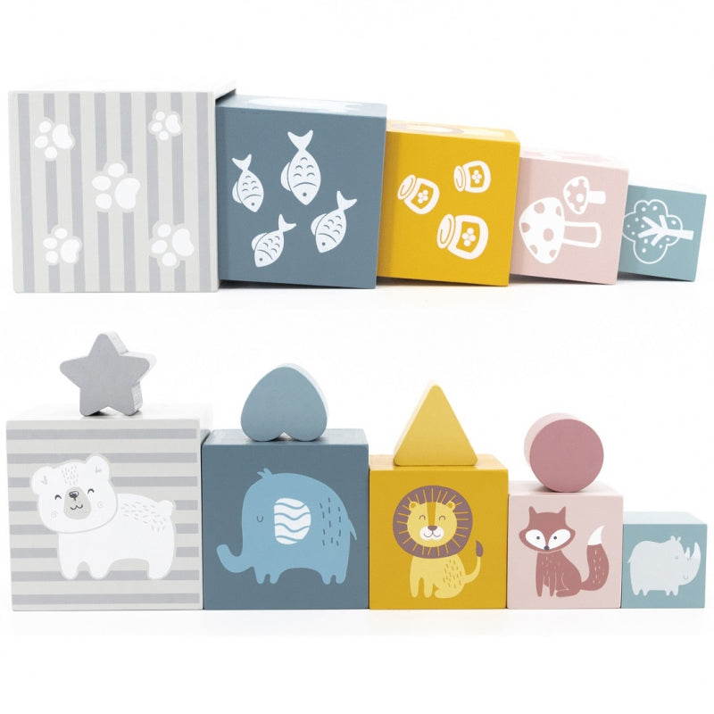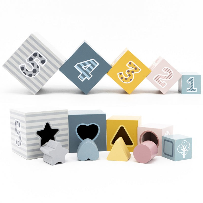 Tai 5 įvairaus dydžio medinių kubelių ir 4 prislopintų spalvų geometrinių figūrų blokų rinkinys.
