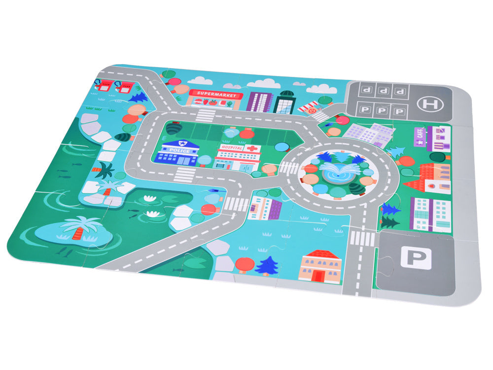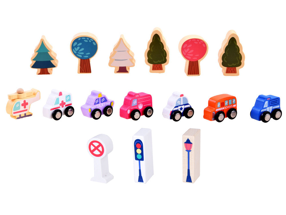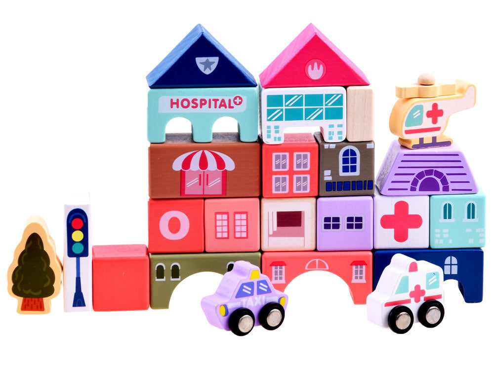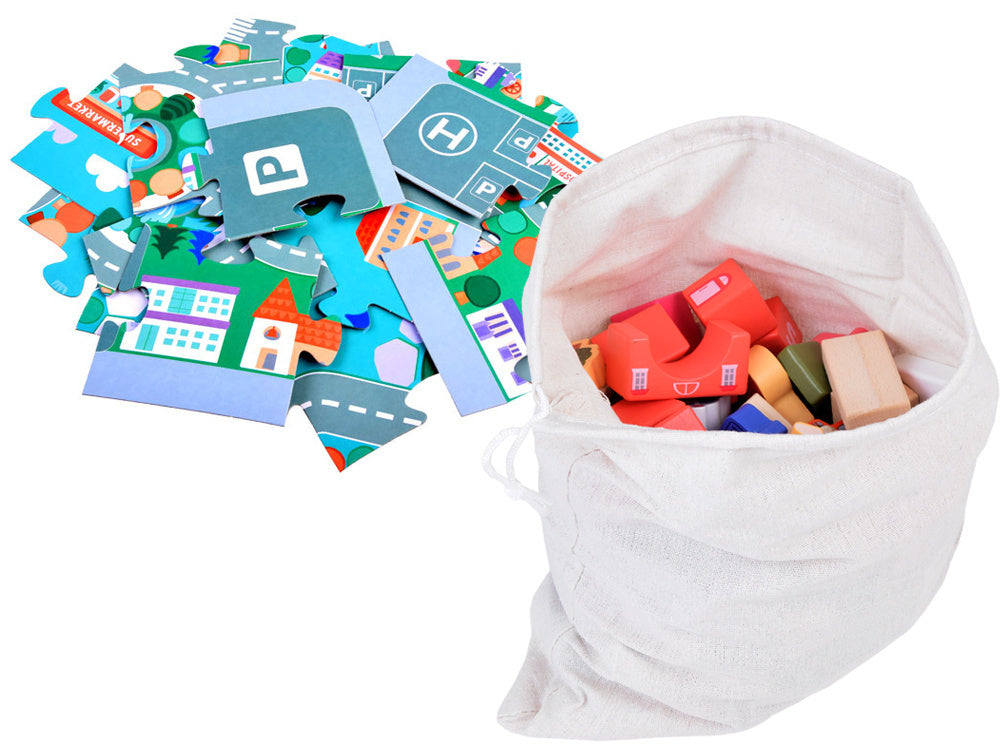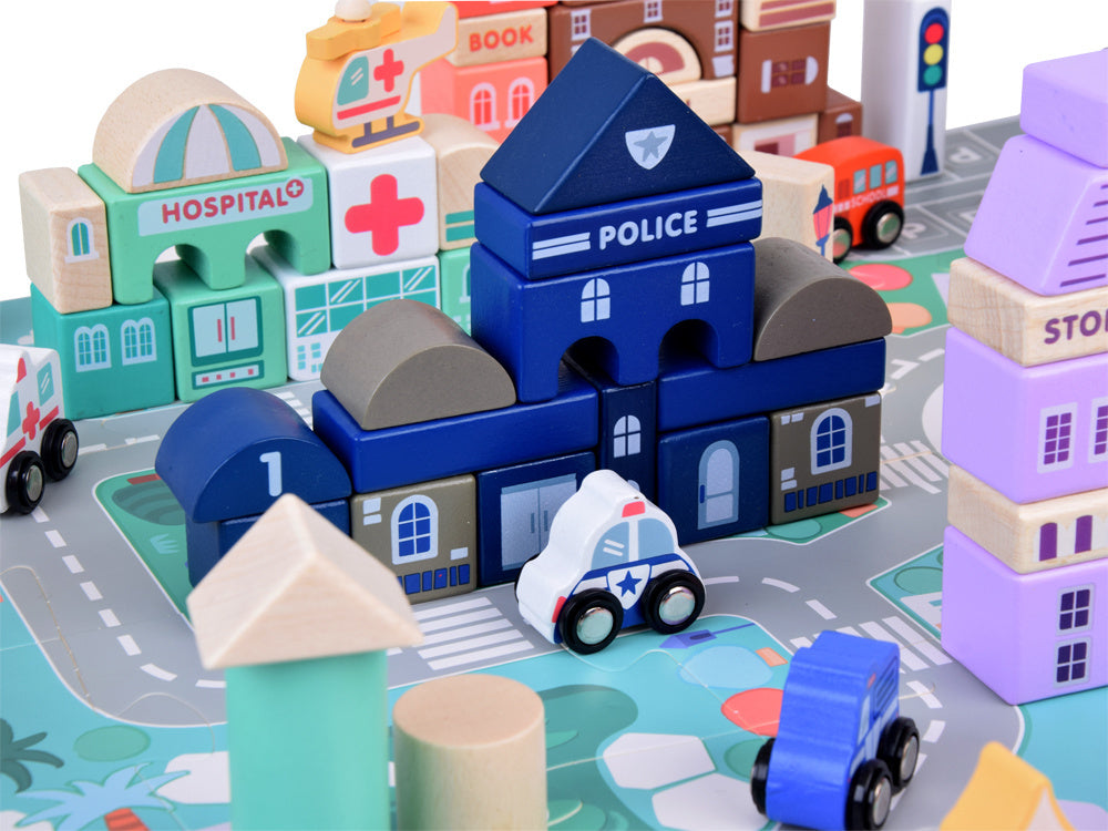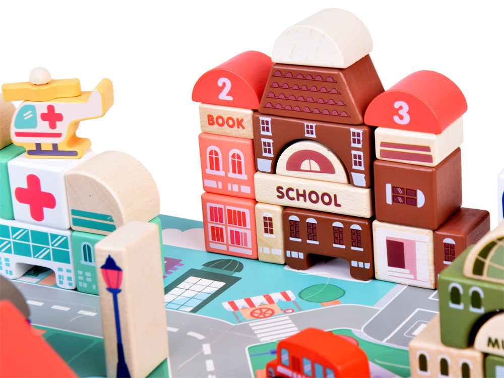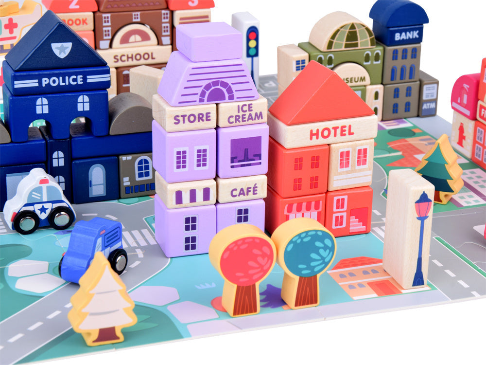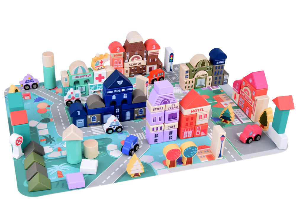 Su šiuo dideliu medinių kaladėlių rinkiniu sukurkite fantastišką, spalvingą miestą nuo A iki Z! Rinkinyje yra net 115 skirtingų formų ir spalvų elementų. Iš jų statysite įvairius pastatus, prie kurių galėsite privažiuoti naudodami mielus automobiliukus su judančiais ratukais. Rinkinyje taip pat yra sraigtasparnis su besisukančiu sraigtu. Prieš pradedant žaisti su kaladėlėmis, pravartu sudėti dėlionę, kurioje pavaizduotas miestas. Baigę žaisti su kaladėlėmis, galite jas sudėti į medžiaginį maišelį, kuris pridedamas prie rinkinio. Taip bus lengviau palaikyti švarą namuose.