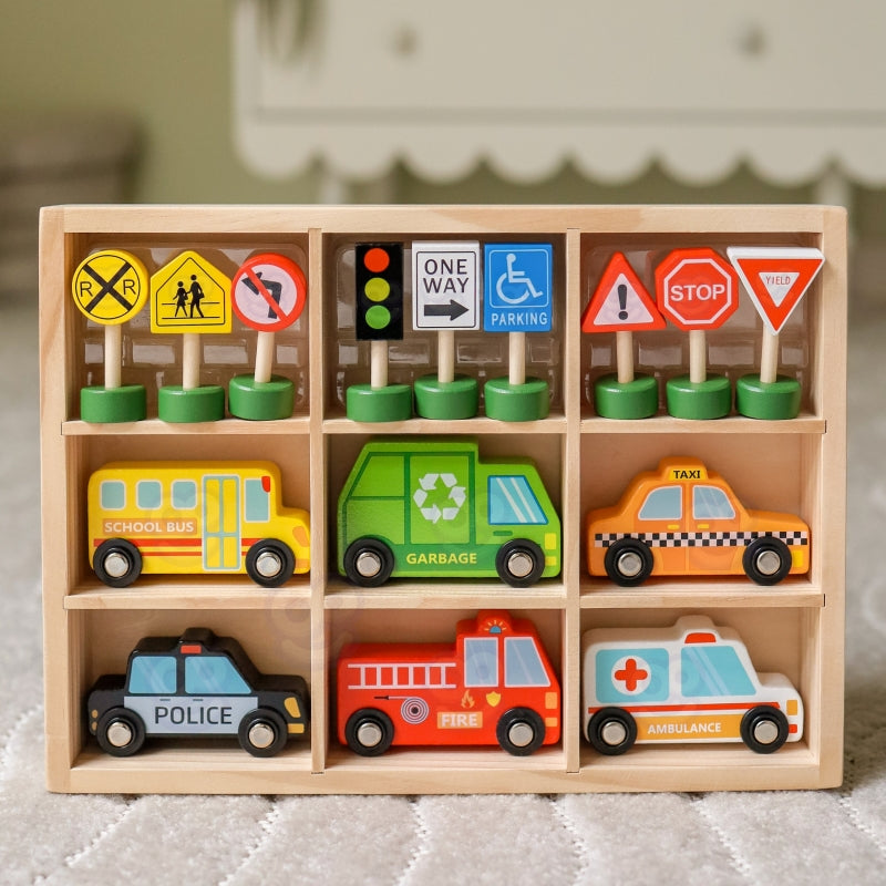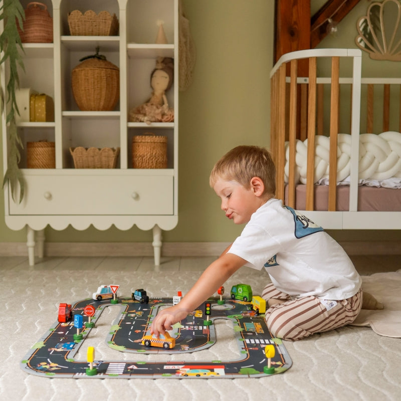 Woopie Green medinis rinkinys yra puiki mokymo priemonė, kuri žaidimo būdu supažindina vaikus su eismo taisyklių pasauliu. Rinkinyje yra 6 spalvingi automobiliai ir 9 kelio ženklai, kurie padeda vaikams išmokti pagrindines kelių eismo saugumo taisykles. Visas rinkinys pagamintas iš tvirto medžio ir saugių, netoksinių dažų.