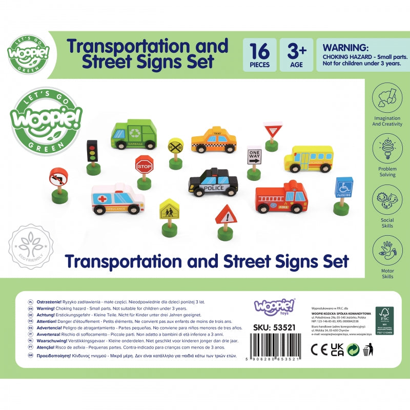 Medinių transporto priemonių ir kelio ženklų rinkinys 15 vnt., WOOPIE GREEN