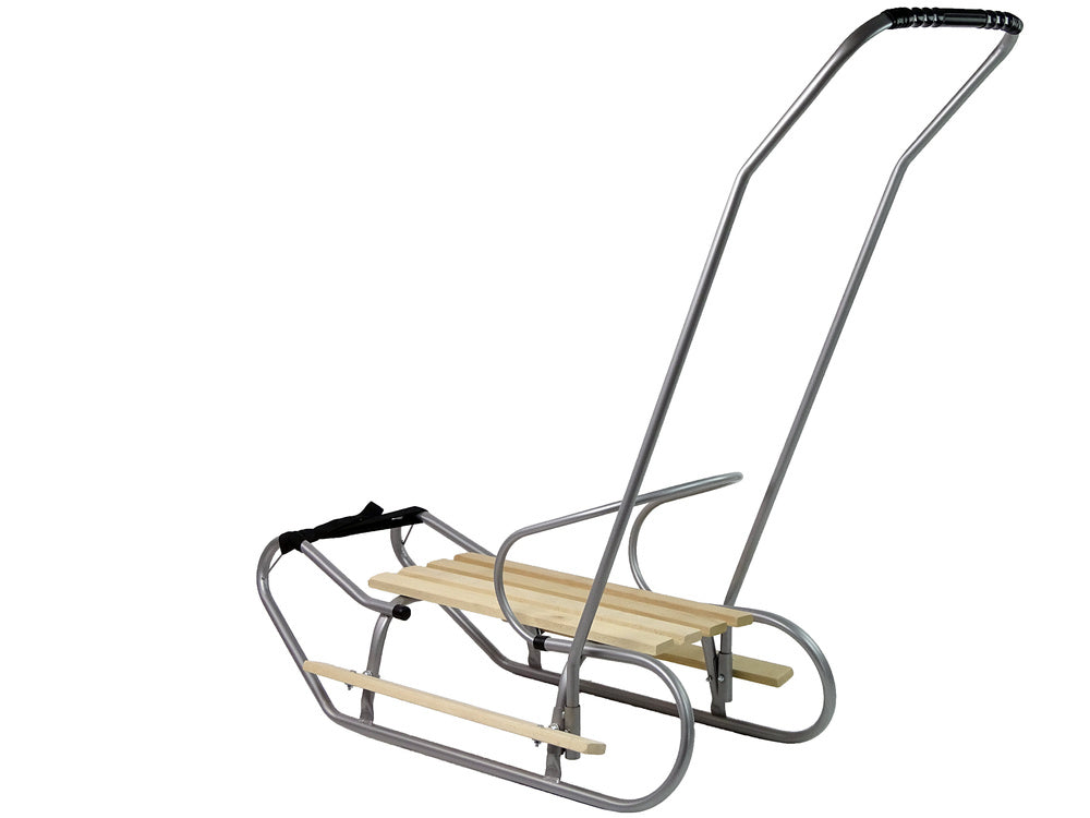 Metalinio rėmo rogės su atlošu ir stūmimo rankena, sidabrinės