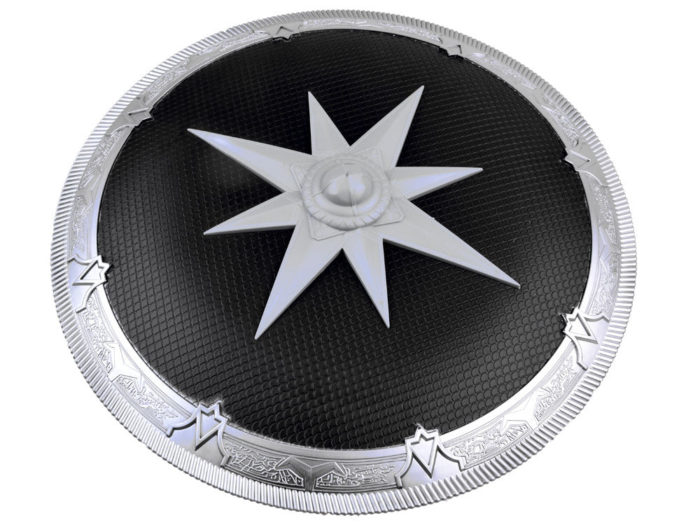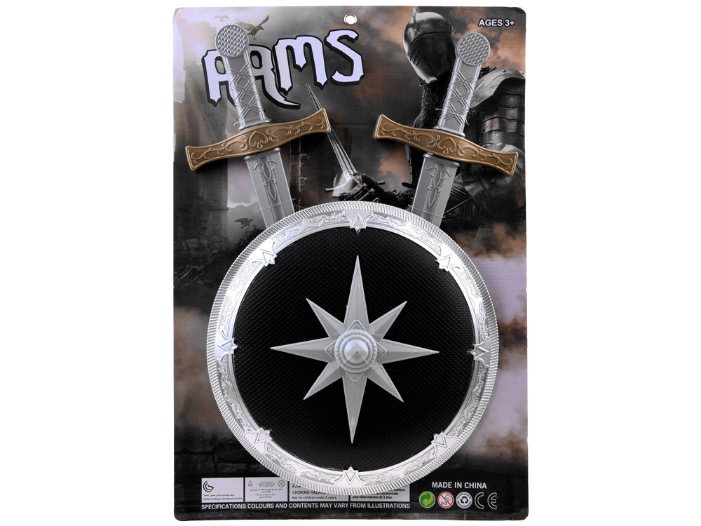 Dwa miecze plus tarcza obronna to zestaw dla każdego małego rycerza. Zestaw w całości wykonany z plastiku. Komplet zachowany w kolorystyce srebrno czarnej. Idealny zestaw dla każdego małego rycerza na bal, do zabawy z kolegami. Tarcza z gwiazdą z przodu, od spodu ma wygodną rękojeść do trzymania. Miecz jest lekki, pusty w środku, dzięki czemu nie ma opcji zrobienia krzywdy zabawką.