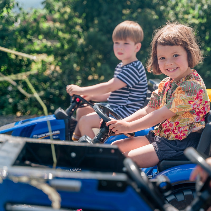 Vaikiškas minamas traktorius New Holland, Falk gamintojo su kaušu ir priekaba. Priekaboje vaikas galės vežti smėlį, lapus, žemę ir akmenis transportuoti iš vieno sodo galo į kitą. Kaip tikras sodininkas ar ūkininkas, vaikas ugdys savarankiškumą ir vaizduotę.