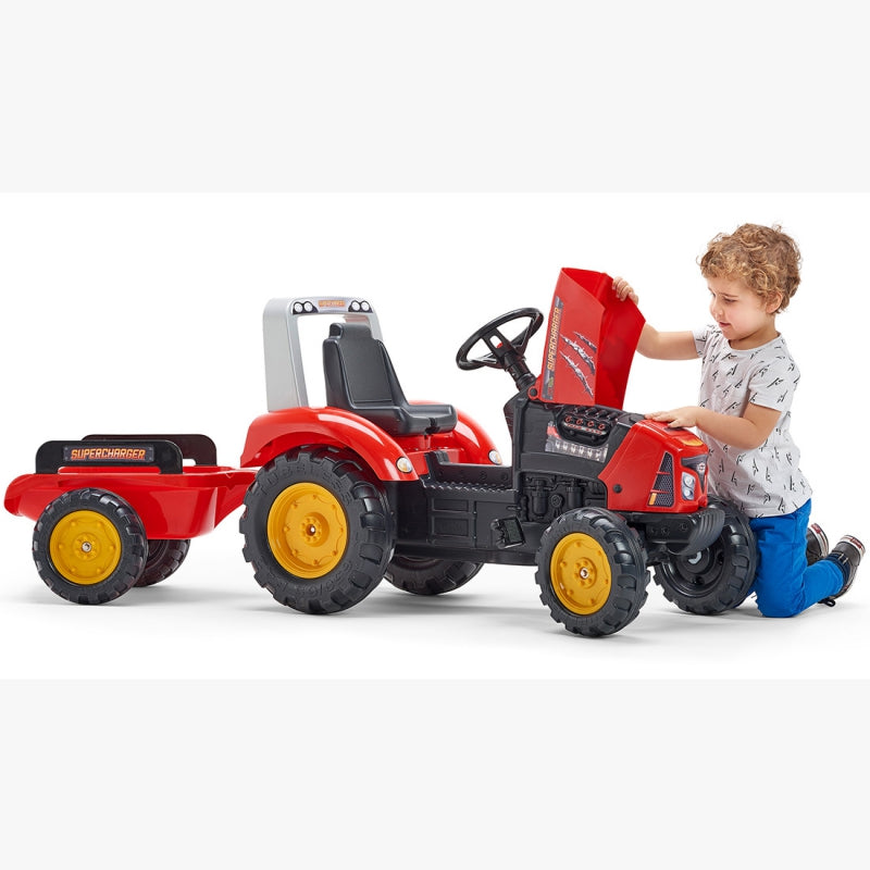 Pagaminta kruopščiai, atkreipiant dėmesį į smulkiausias detales! Transporto priemonėje sumontuota nuimama priekaba ir vairas su garso signalu.