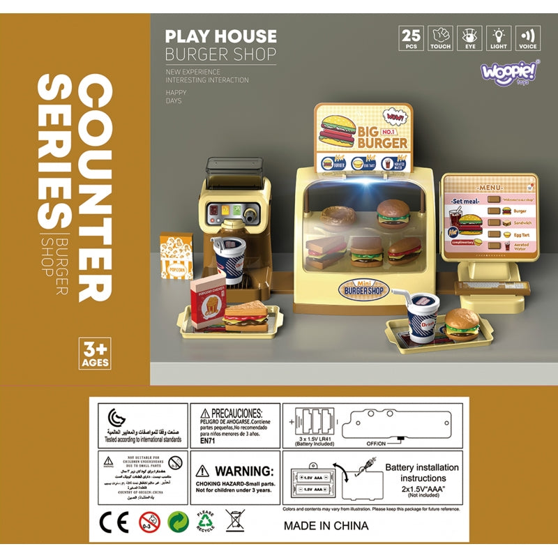 WOOPIE prekės ženklo "Mini Burger Shop BIG BURGER" yra puikus žaidimų rinkinys. Galime aptarnauti klientus, kurie renkasi patiekalus tiesiai nuo apšviesto prekystalio! Jame yra ekranas su mygtukais, kuriuos paspaudus parduotuvė mums skleidžia garso efektus! Į automatą galime pilti vandenį ir pilti jį į specialiai tam skirtus puodelius su šiaudeliu. Rinkinys lavina rankų darbo įgūdžius, vaizduotę, kūrybiškumą ir savarankišką mąstymą.